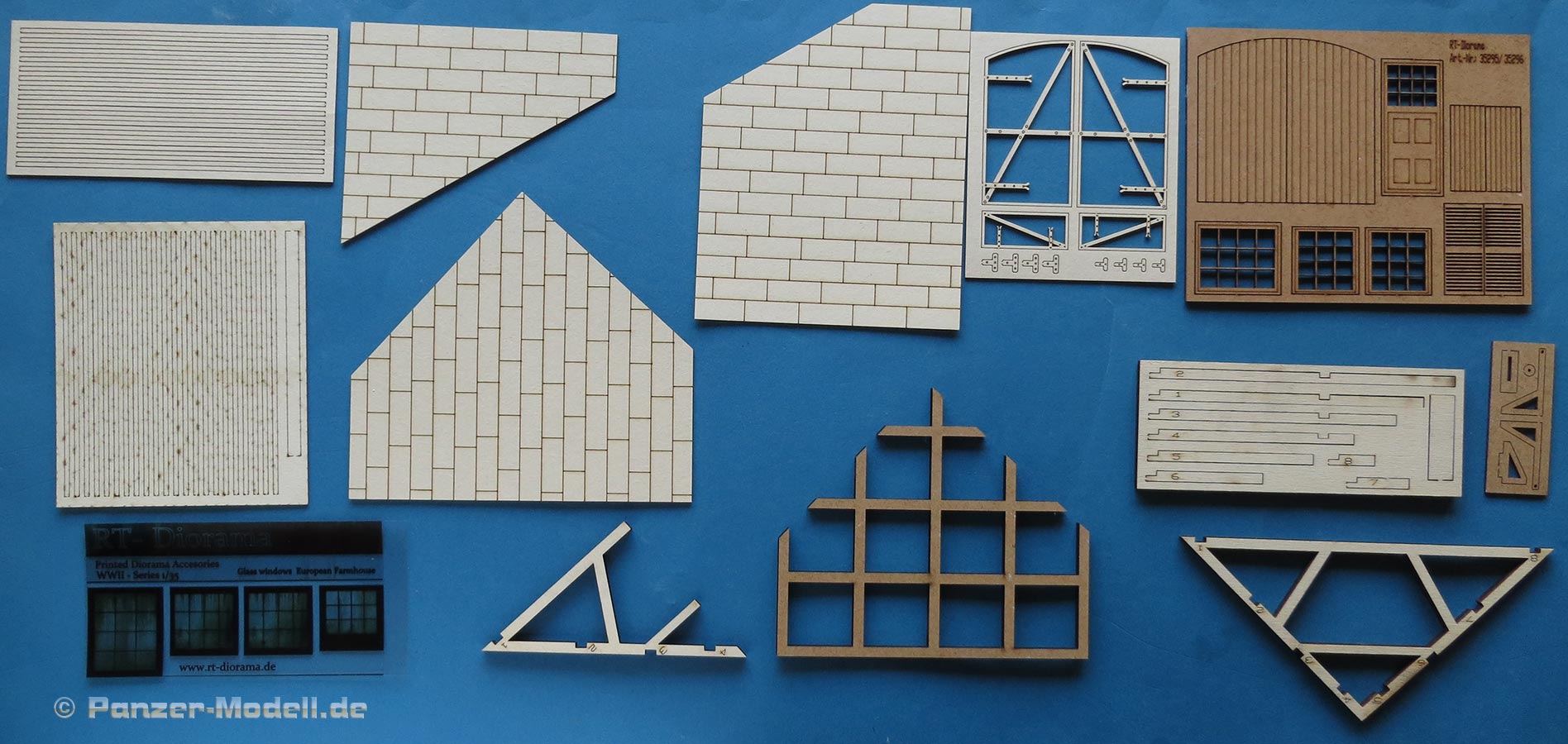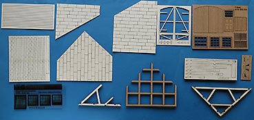 Der Bausatz umfasst 7 Gießkeramik Teile, 6 gelaserte Holzteile sowie 6 weitere Holzplatten mit darin enthaltenen gelaserten Holz Kleinteilen und einem Polyacetatbogen mit aufgedruckten Fensterdetails.