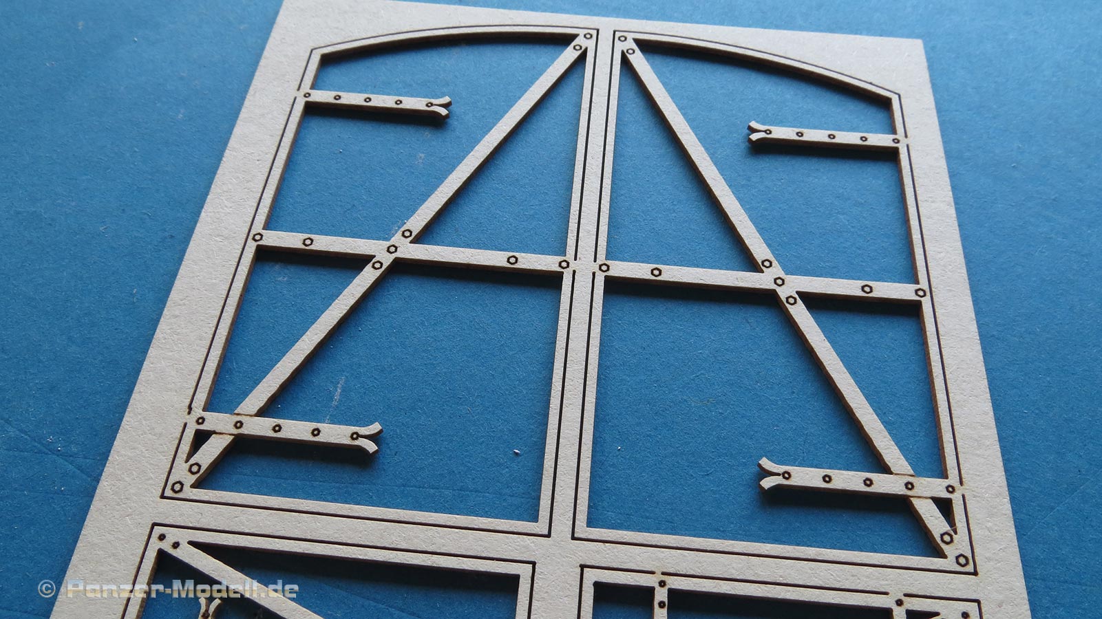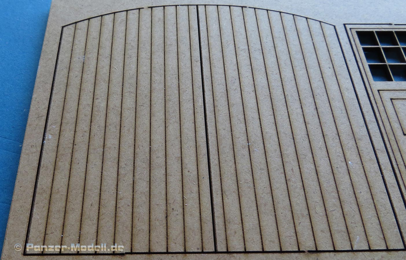 Auch die Haustür und das Garagentor aus gelasertem Holz macht einen ausgezeichneten Eindruck mit feinen Details der Holzbretter - die Beschläge werden extra on Top aufgebracht und das macht die Torflügel wirklich extra-realistisch.