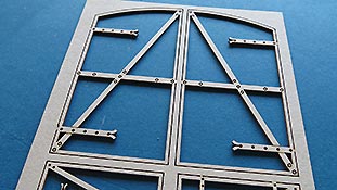 Die Öffnungen für Tür, Fenster und das Garagentor sind bereits ausgelassen und werden mit gelaserten Holzfensterrahmen und dem "Fensterglas" aus Polyacetatfolie vervollständigt. Die Folie ist bereits bedruckt und stellt damit leicht angelaufene und verschmutzte Fenster dar.
