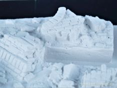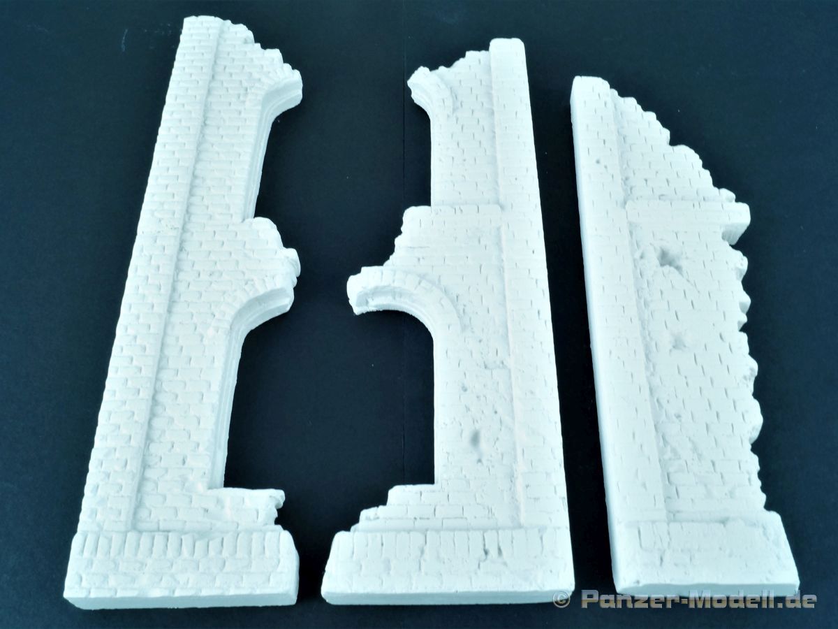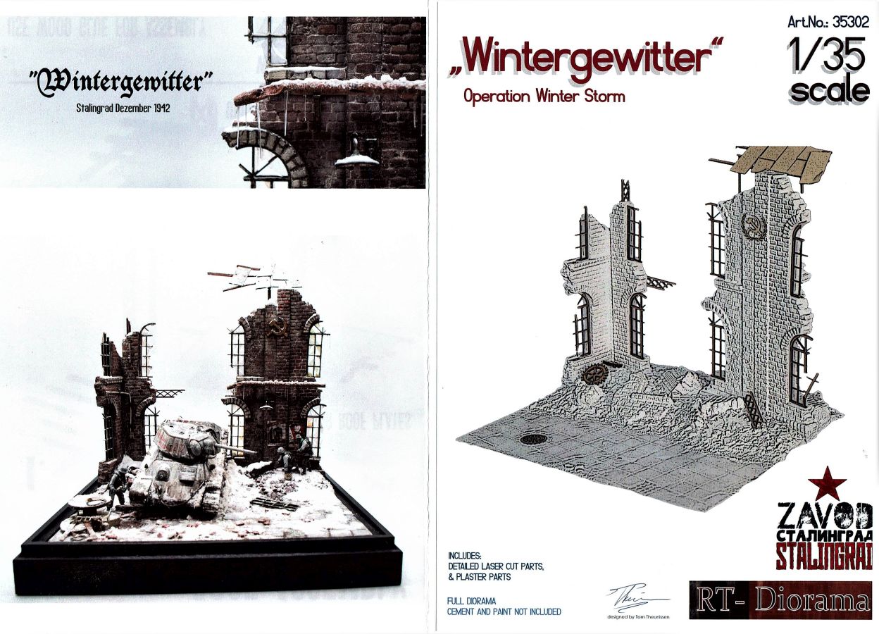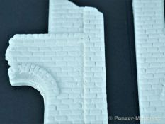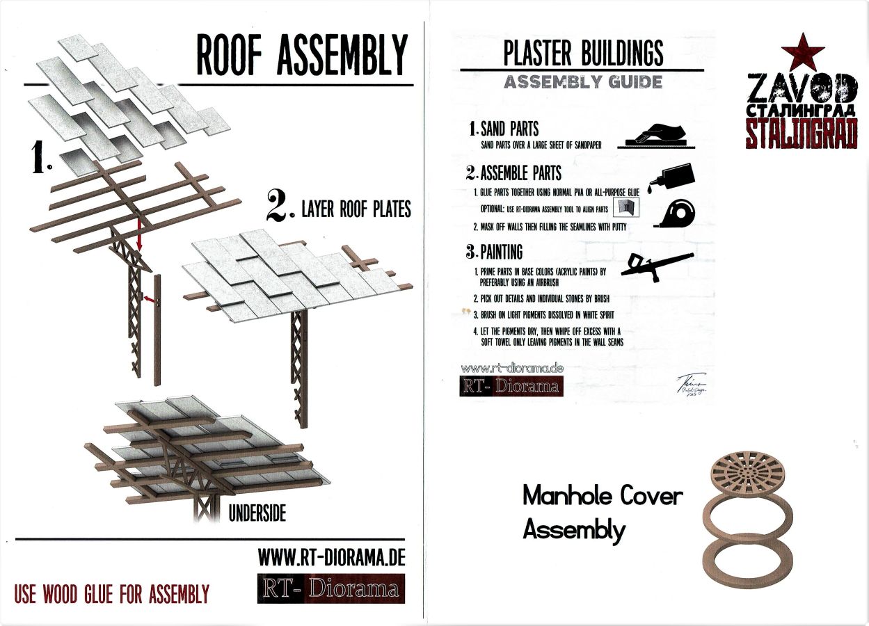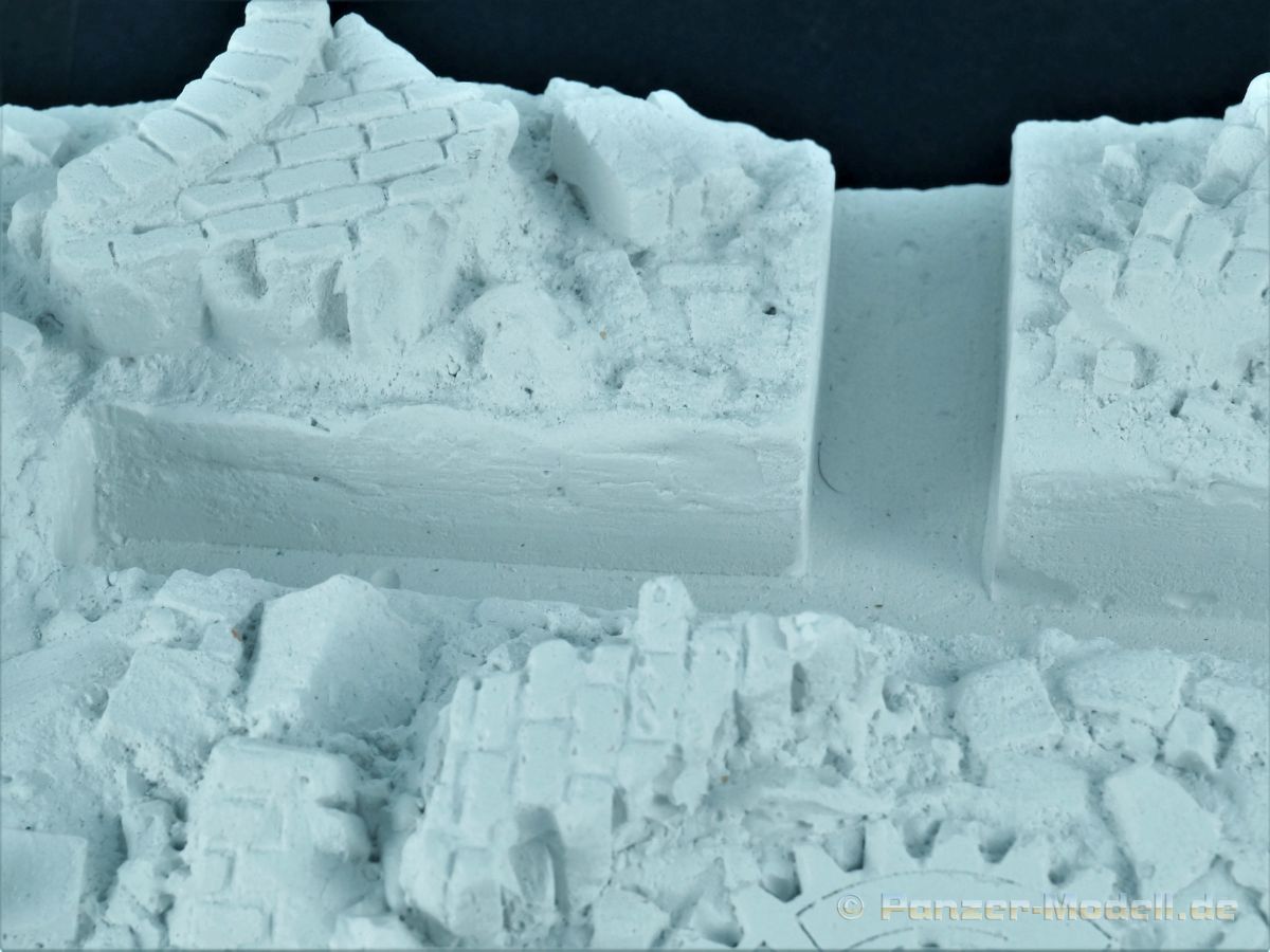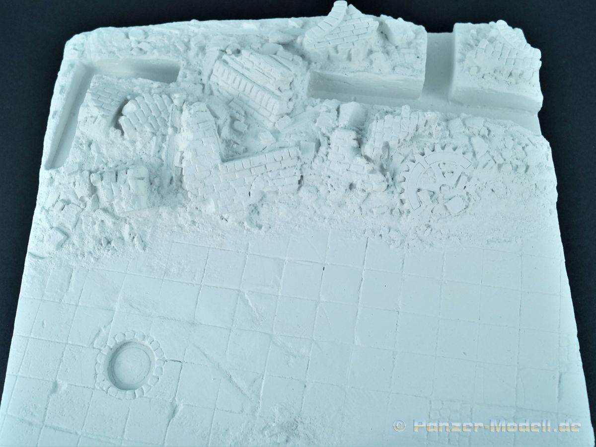 Alle Teile werden in einem stabilen Karton geliefert. Gepolstert mit Blisterfolie und Styrodur. Der Bausatz umfasst eine Grundplatte, fünf Gebäudeteile und und vier Lasercutplatten. Das Dio baut auf einer Grundfläche von ca. 28 x 24 cm auf und stellt im Ausschnitt eine zerstörte Fabrik dar deren Höhe rund 25 cm (+/-) beträgt. Links und rechts erheben sich noch Mauerreste des Gebäudes während dazwischen ein Durchbruch liegt. Im Vordergrund verläuft eine mehr oder weniger ramponierte Straße die zumindest Platz für einen mittleren Panzer (z.B. IV) bietet. Geröll, Schutt und Ziegelmaueren sind bereits an die Grundplatte anmodelliert. Alles richtig schön gemacht und auch ausreichend. Wer will kann sich aber noch weiter austoben. RT-Diorama bietet auch hierfür entsprechendes Material an. Die Montage der Teile ist auf dem Deckelbild ersichtlich und dürfte ebenfalls keine Probleme bereiten. Die gelaserten Fenster sind noch zu bearbeiten, passen aber ohne große Nacharbeit. Gleiches gilt auch für den Gullydeckel. Als Lasercutteile sind auch Armierungen bzw. Trägersysteme vorhanden die die Ruine interessanter machen. Typische Verzierungen von russischen Farbriken sind ebenfalls vorhanden wie z.B. der Sowjetstern. Wenn dieser nicht verwendet wird ist man in der Ortswahl des Fabrikstandorts flexibler. Überdimensionierte Zahnräder können ebenfalls in den Schutt eingearbeitet werden. Abgerundet wird alles durch ein desolates Dach mit seiner Unterkonstruktion. Alle Teile des Bausatzes haben eine überzeugende Mauerstruktur. Die Beschädigungen, sei es durch Beschuß oder anderen äußeren Einwirkungen sind überzeugend dargestellt. Hier kann die Straße ebenfalls punkten. Auch hier finden sich entsprechende, nicht übertriebene Beschädigungen. Auf dem beiliegenden DIN A4 Faltblatt gibt es noch ein paar Hinweise zum Bau allgemein und zusätzlich für das Dach und den Gullydeckel. Der Bau sollte niemanden überfordern und auch relativ schnell erfolgen. Tja, und dann beginnt der eigentliche Spaß. Die Bemalung… !!! Ein toller Bausatz, der aber noch genügend Raum für eigene Ideen freilässt. Eine ganz klare Empfehlung von meiner Seite! Für den Zusammentbau etc. gibt es auf der Seite von RT-Diorama auch eine eigene „Step by Step“ Anleitung. Ebenfalls interessant und auf der Startseite verfügbar ist ein Video von MBK, das uns einen Blick hinter die Kulissen von RT-Diorama werfen lässt und einem die Produktion näher bringt. Dazu noch eine Anmerkung: Die Bausätze sind im Hinblick auf die Gipsteile einmal als „Standard“ oder als „Keramic“ offeriert. Naturgemäß schlägt „Keramic“ (noch stabiler als Gips) damit mit einem höheren Preis zu Buche. Die Wahl ist aber Ermessenssache. Wir bedanken uns bei RT-Diorama für das Besprechungsmuster.