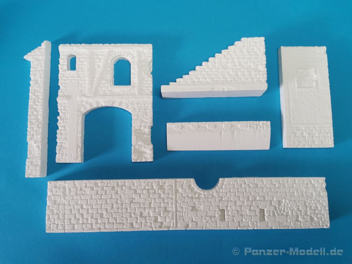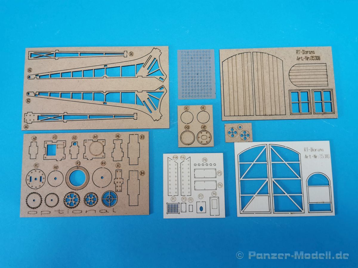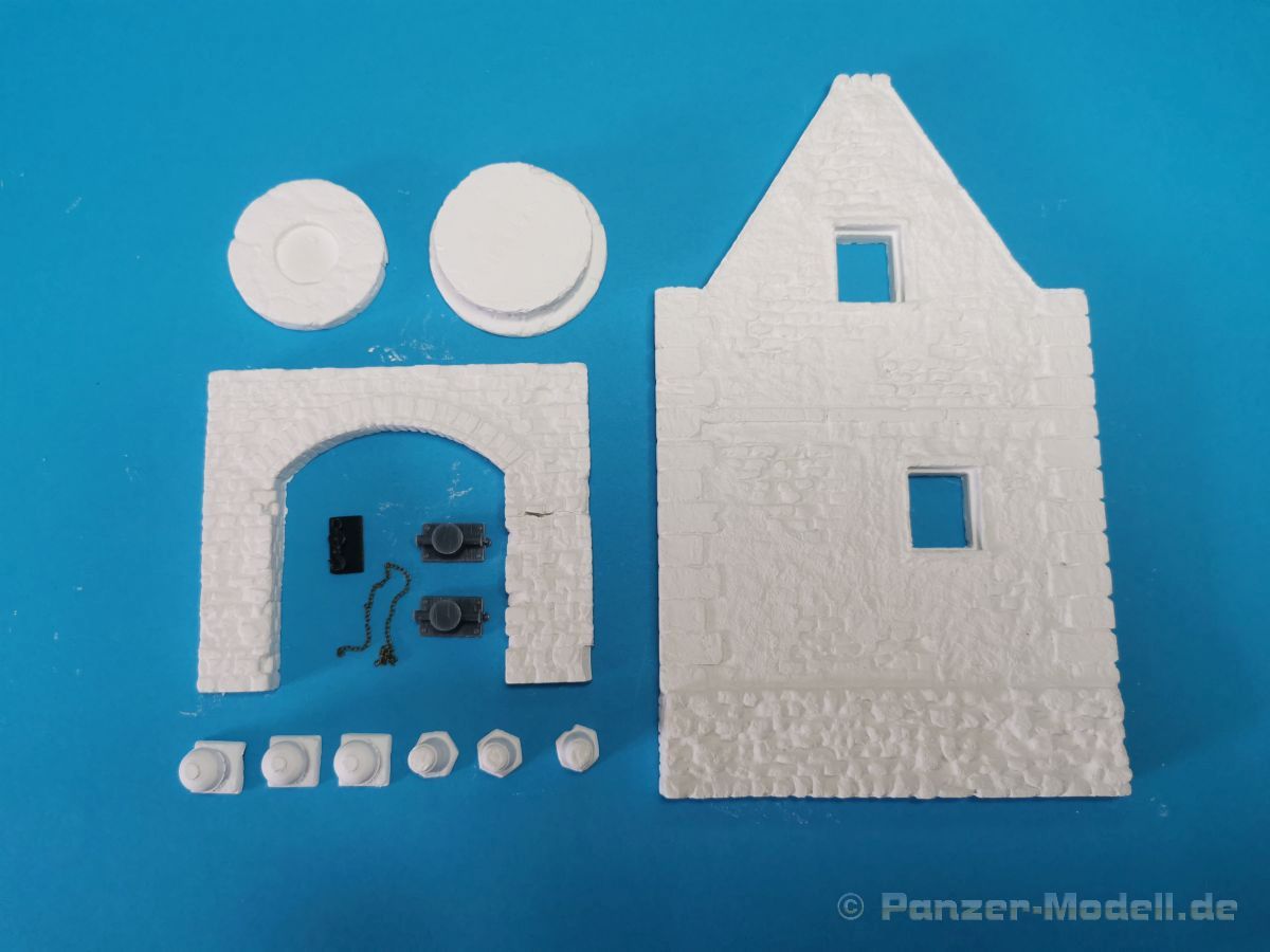 Mit dem vorliegenden Set 35308, Marne River Port, WW I, lässt sich eine Szene an einem innerstädtischen Hafen bauen. Dieser Hafen liegt dann an der Marne, einem Fluss in Frankreich, irgendwo in irgendeiner Ortschaft. Zeitlich angesiedelt ist die Szene, gemäß dem Titel, für den Zeitraum des ersten Weltkrieges, jedoch lässt sich das Set auch durchaus für eine spätere Epoche anwenden. Das Diorama besteht aus sehr gut detaillierten Bauteilen aus Gießkeramik für die Darstellung von zwei Gebäuden und einem Torbogen, der Grundplatte, der Hafenmauer und einer Treppe. Um es hier nochmal deutlich zu erwähnen, es handelt sich hierbei um Bauteile aus Gießkeramik, nicht aus Gips. Das hat den Vorteil, dass die Bauteile erheblich stabiler sind als Gipsbauteile. Das Grundmaß der Bodenplatte beträgt 32 x 22,5 cm, die Gesamthöhe des Dioramas liegt bei etwa 31 cm. Wie üblich ist die Rückseite der Keramikbauteile nicht detailliert ausgeführt, bei Bedarf lassen sich aber nachträglich Gravuren hinzufügen. Eine ausführliche Beschreibung der dazu erforderlichen Vorgehensweise sowie für den Zusammenbau der Keramik-Bauteile findet man hier auf der Webseite des Herstellers. Eine Bauanleitung für die Montage der Gebäudeteile ist nicht im Set vorhanden. Diese ist meines Erachtens auch nicht nötig da man anhand des Deckelbildes den Aufbau gut erkennen kann. Für die Ausstattung der Gebäude liegen Fenster, Holztore und ein Gittertor aus per Laser geschnittenem Holz bei. Die Verglasung der Fenster wird mit den beiliegenden, bereits bedruckten und gealterten Folien dargestellt. Darüber hinaus liegen Poller, zum Vertäuen der angelegten Schiffe oder Boote, aus 3-D-Druck bei und Absperrpoller aus Keramik bei. Der 4-to-Kran wird aus lasergeschnittenem Holz dargestellt und bekommt einen Sockel aus Keramikbauteilen. Für den Zusammenbau des Krans liegt eine ausführliche Bauanleitung bei. Warum diese Anleitung 2x vorhanden ist erschließt sich mir jetzt nicht wirklich. Man findet sie nämlich einmal separat und ein weiteres Mal in dem Blatt mit dem Produktfoto, auf dessen Rückseite sich einige Poster / Plakate, thematisch in dem Zeitraum WK I angesiedelt, zur Ausstattung der Gebäude befinden. Weiterhin gibt es dort grundlegende Hinweise für die Dachkonstruktion. Ich bin total begeistert von der, mit viel Liebe zum Detail, ausgeführten der Mauer- und Holzteile für die Gebäude. Die Maserung der alten Fachwerkbalken, kleine Schäden an den Mauersteinen, die Abnutzungen an den Stufen der Treppe… alles ist sehr realistisch und sehr schön detailliert dargestellt. Siehe dazu auch die Detailfotos. Fazit: Das gesamte Set beeindruckt durch die Fülle an Details und natürlich auch durch die Anzahl der Bauteile. Man bekommt hier für sein Geld einen erstklassigen Dioramabausatz. Sicher, der Preis von ca. 120,- € für das vorliegende Set lässt einen erstmal schlucken… aber es besteht ja aus den Gießkeramikbauteilen. Als günstigere Alternative gibt es das Set auch mit Gipsbauteilen, die aber etwas weniger stabil sind, für rund 80,- €. Wir bedanken uns bei Rudi Theunissen für den Musterbausatz!