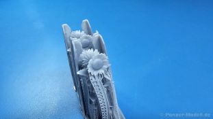 Wer eine schnelle Ausschmückung für eine Vignette und ein zusätzliches Detail für ein Diorama sucht und sich die langwierige Arbeit des Selbstbaus sparen will, dem wird die neue 3D-Druck Serie von RT-Diorama gefallen. Das heute vorgestellte Set kommt in einem 105 x 65 x 40 mm stabilen Klappdeckelkarton, der eine wiederverschließbare Klarsichttüte mit vier Sonnenblumen enthält. Sonnenblumen ziehen ein wärmeres Klima vor, blühen in der Zeit zwischen Juni und September und richten ihre Blüten nach der Sonne aus. Diese Tatsachen sollte man bei der Nutzung in einem Diorama im Auge behalten. Zumindest sollte alle Blüten in die gleiche Richtung weisen, wenn man mehrere Sonnenblumen zusammen verwenden. Jede Pflanze besteht aus einem langen Stiel mit mehreren Blättern und den geneigten Blüten und ist ca. 55 mm hoch. Der Druck gibt die Blütenform und -struktur und die Blätter gut wieder. Die Druckbasis hat an den Ecken Stützpfeiler, die die Pflanzen vor Beschädigung weitgehend schützen. Das Material ist noch flexibel und lässt sich noch formen. Im Sonnenlicht härtet es dann aber aus. Ein großartiges Set für ein Sommerdiorama, schnell und einfach zu verwenden. Abtrennen, bemalen und ins Diorama einkleben – fertig