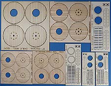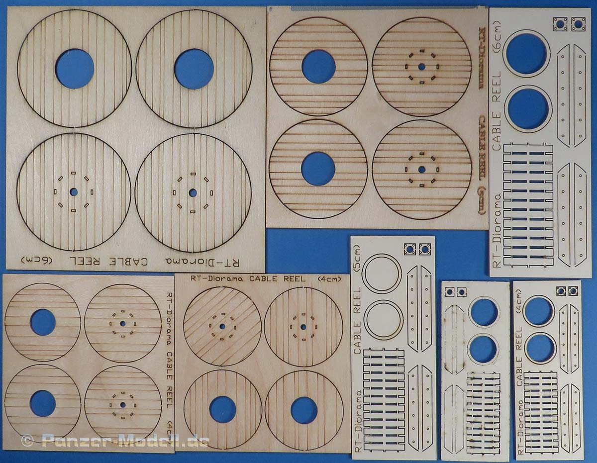 In der Verpackung finden wir 8 dünne, lasergeschnittene Holzplatten zum Bau von insgesamt 4 großen Kabelrollen, wie man sie auch heutzutagen noch kennt. Es lässt sich eine Rolle mit 6cm, eine mit 5cm und zwei mit 4cm Durchmesser bauen.