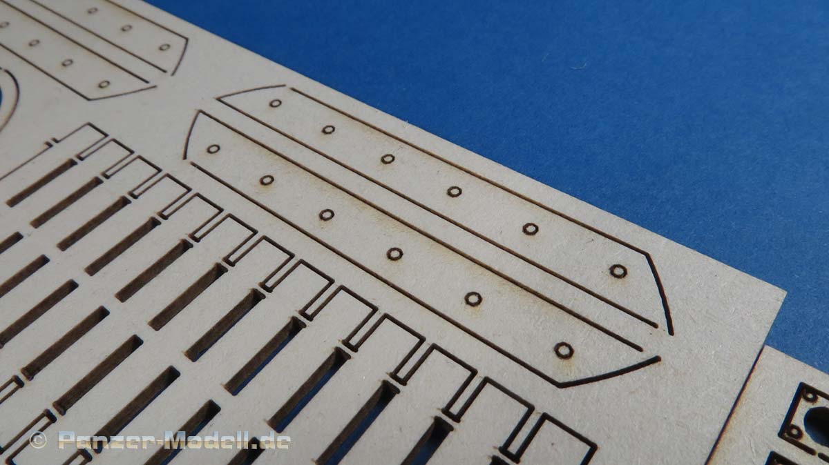 Diese Achse ist wirklich tricky gemacht - in einem Stück gelasert kann man sie entsprechend einrollen und exakt in die Seitenwandaussparungen einstecken und mit Weißleim fixieren. Das sieht richtig gut und realistisch aus.