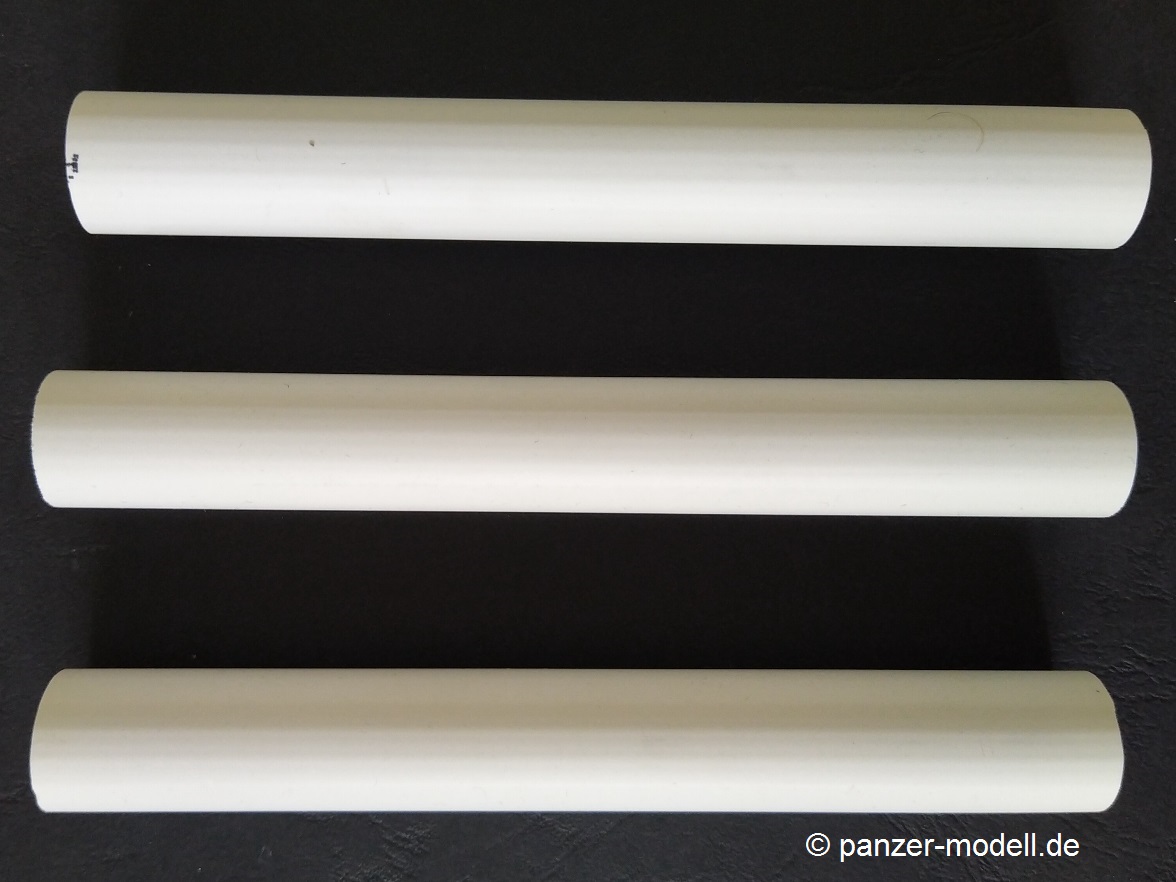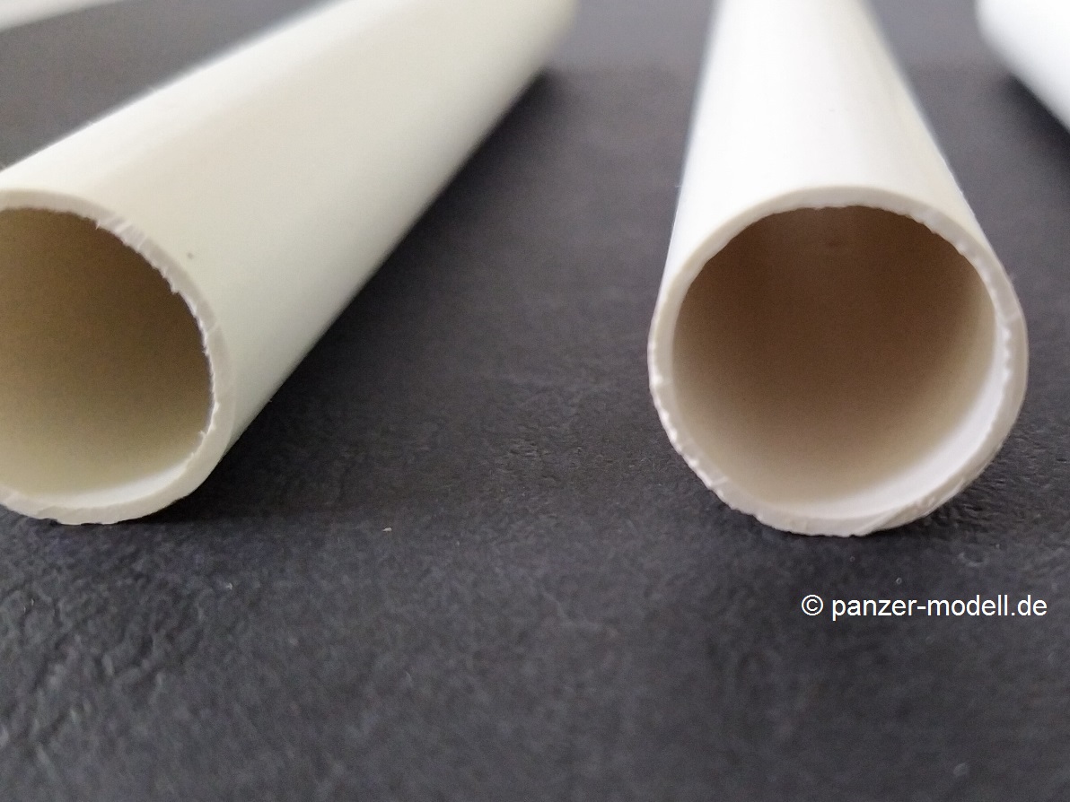 Die Rohre sind aus PVC-Meterware abgelängt und müssen an den Enden und an der Außenseite noch ein wenig versäubert werden. Sie machen aber in Kombination mit den fein geschnittenen Lasercut-Teilen einen guten und vor allem stabilen Eindruck.