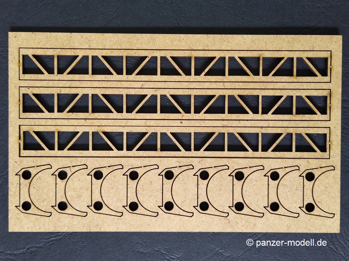 - 4 Stück Lasercut-Holztafel ca. 14,5 x 7,5cm und einer Stärke von ca. 2mm mit 7 Teilen für je einen Stützpfeiler der Rohrbrücke