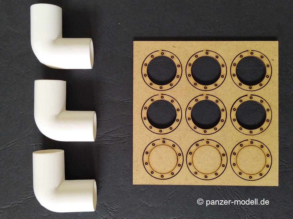 Aus den enthaltenen Teilen lassen sich 3 Rohrwinkel mit den entsprechenden Flanschen bauen. Zur Wahl stehen hier aber außerdem noch 3 geschlossene Flansche, Die Rohre sind aus PVC-Material und müssen noch von Ihren Bedruckungen und leichtem Grad auf der Außenseite befreit werden. Sie machen aber in Kombination mit den fein geschnittenen Lasercut-Teilen einen guten und vor allem stabilen Eindruck. Die enthaltenen Lasercut-Teile für die Rohrflansche sind passgenau auf die PVC-Rohre angepasst und fein ausgeführt. Eine Bauanleitung liegt der Verpackung nicht bei, ist aber auch nicht nötig. Auf Farbangaben wird seitens des Herstellers ebenso verzichtet, muss aber ja auch für den jeweiligen Einsatzzweck vom Modellbauer selber gewählt werden. Mein Fazit: Alles in allem ein schöner Zubehörsatz, den es so bislang noch nicht auf dem Markt gab. Die Kombination aus Lasercut-Bauteilen mit Großserienteilen ist eine interessante Idee, die sicherlich noch weitere Zubehörsets erwarten lässt. absolute Kaufempfehlung.