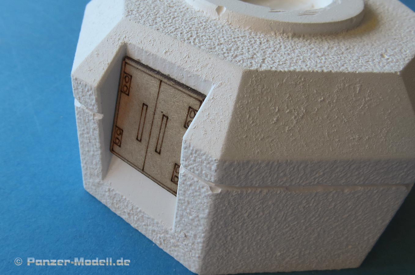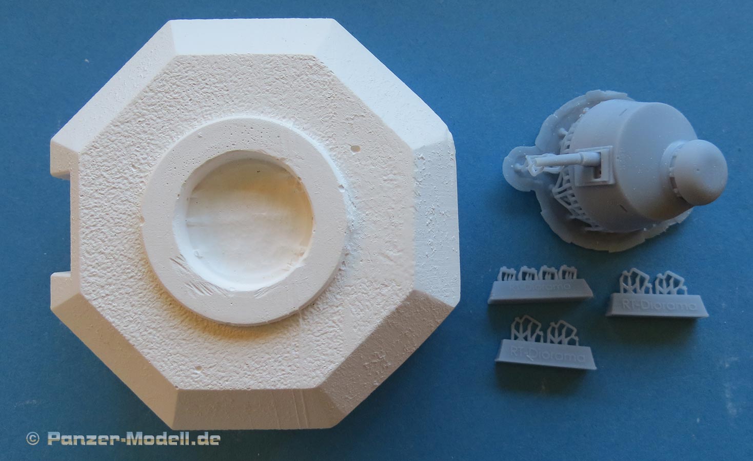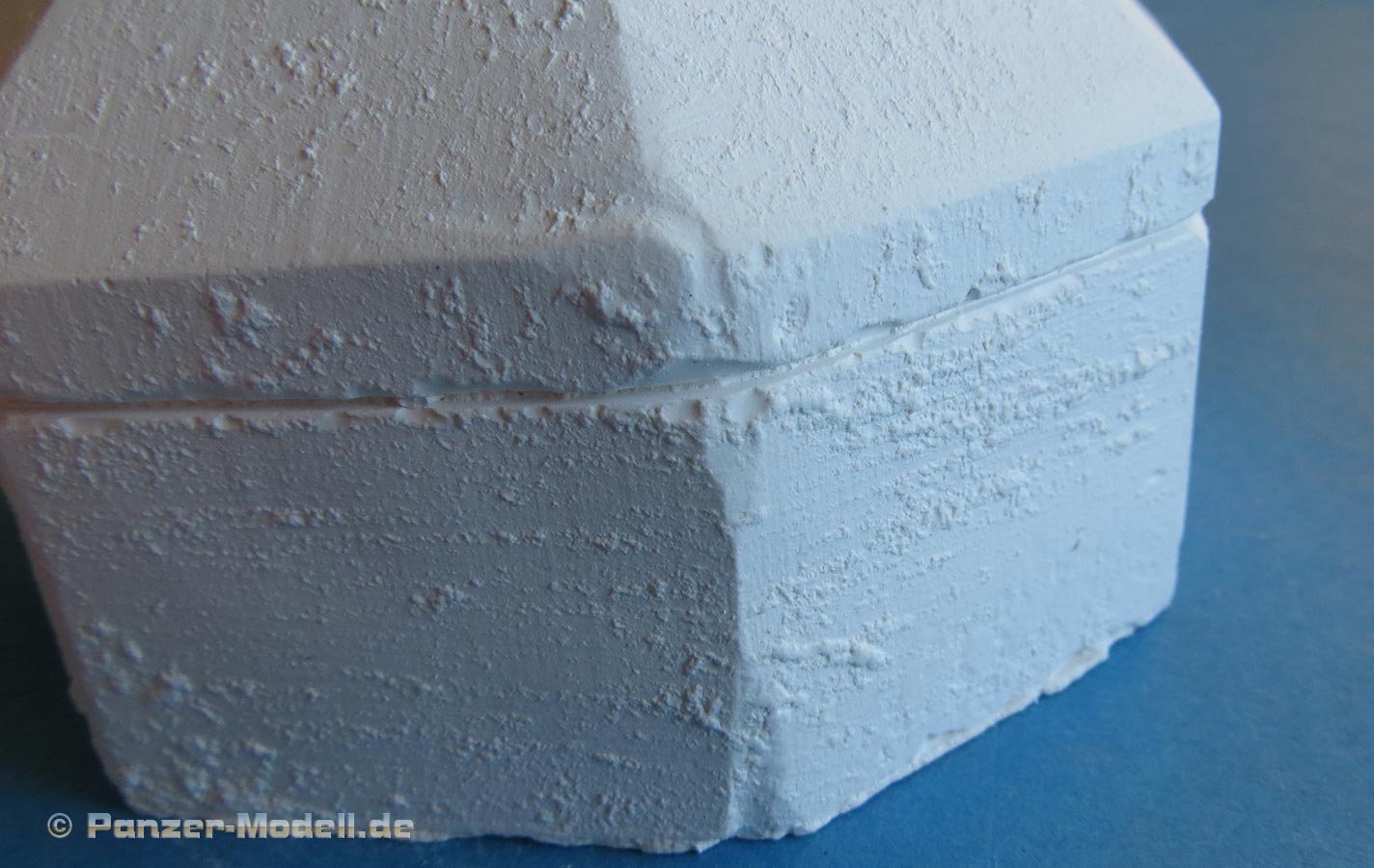 Der Bunkerteil ist aus einem Teil in Gips gegossen ist 8eckig und weist eine eine raue Oberfläche auf - diese würde ich allerdings einmal mit Schleifpapier überziehen um die Struktur ein wenig weniger scharf und erhaben zu haben.