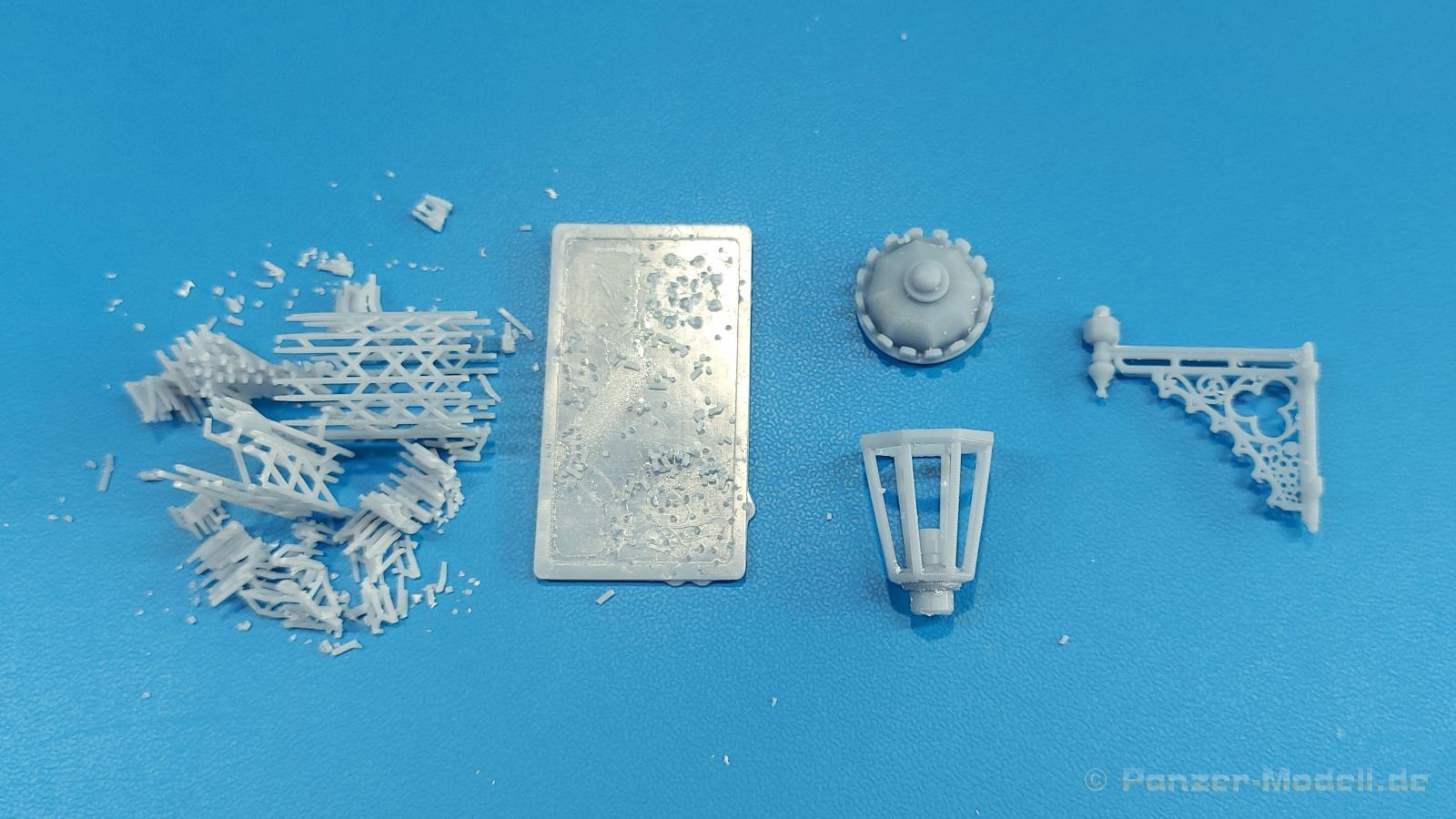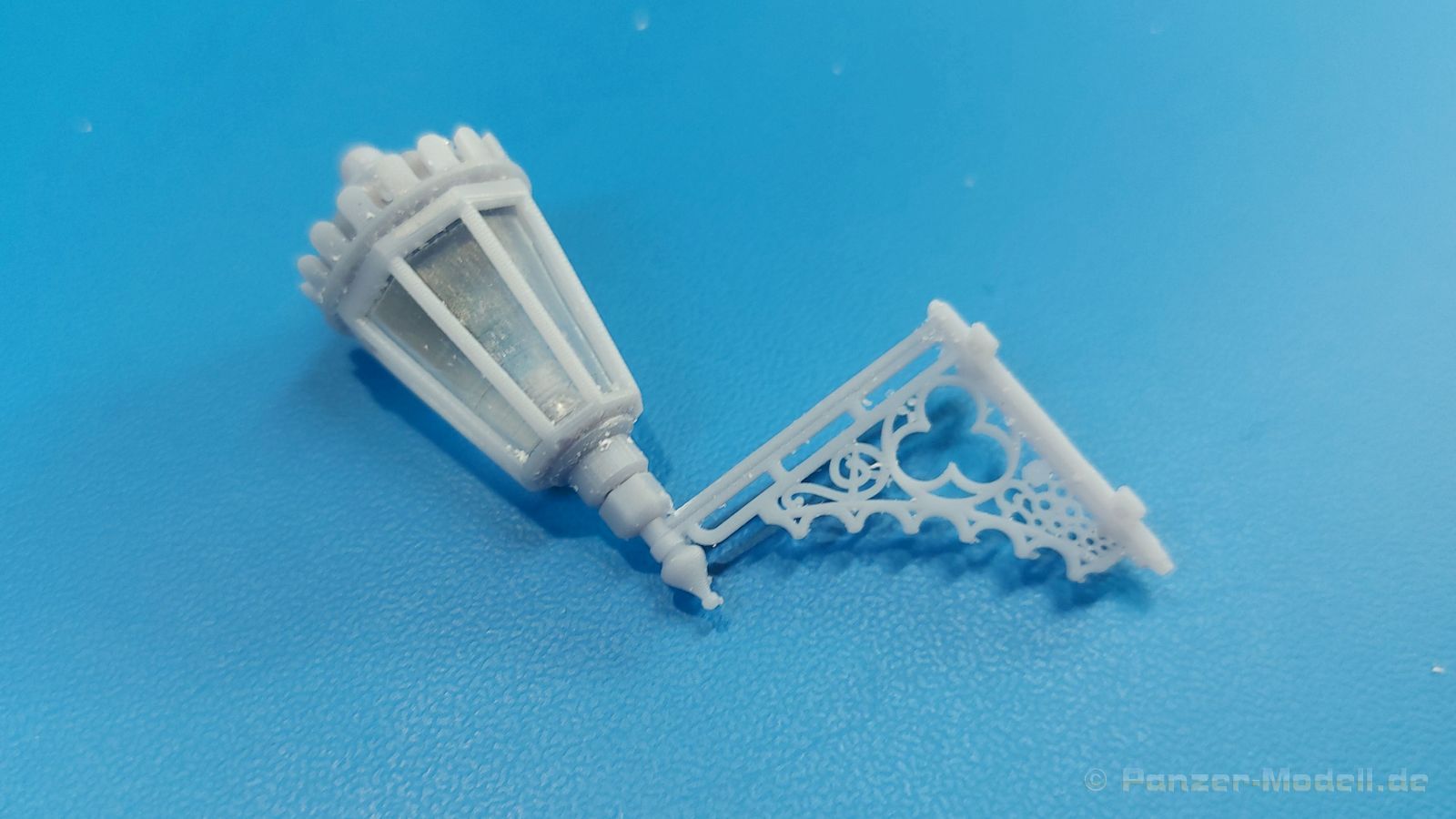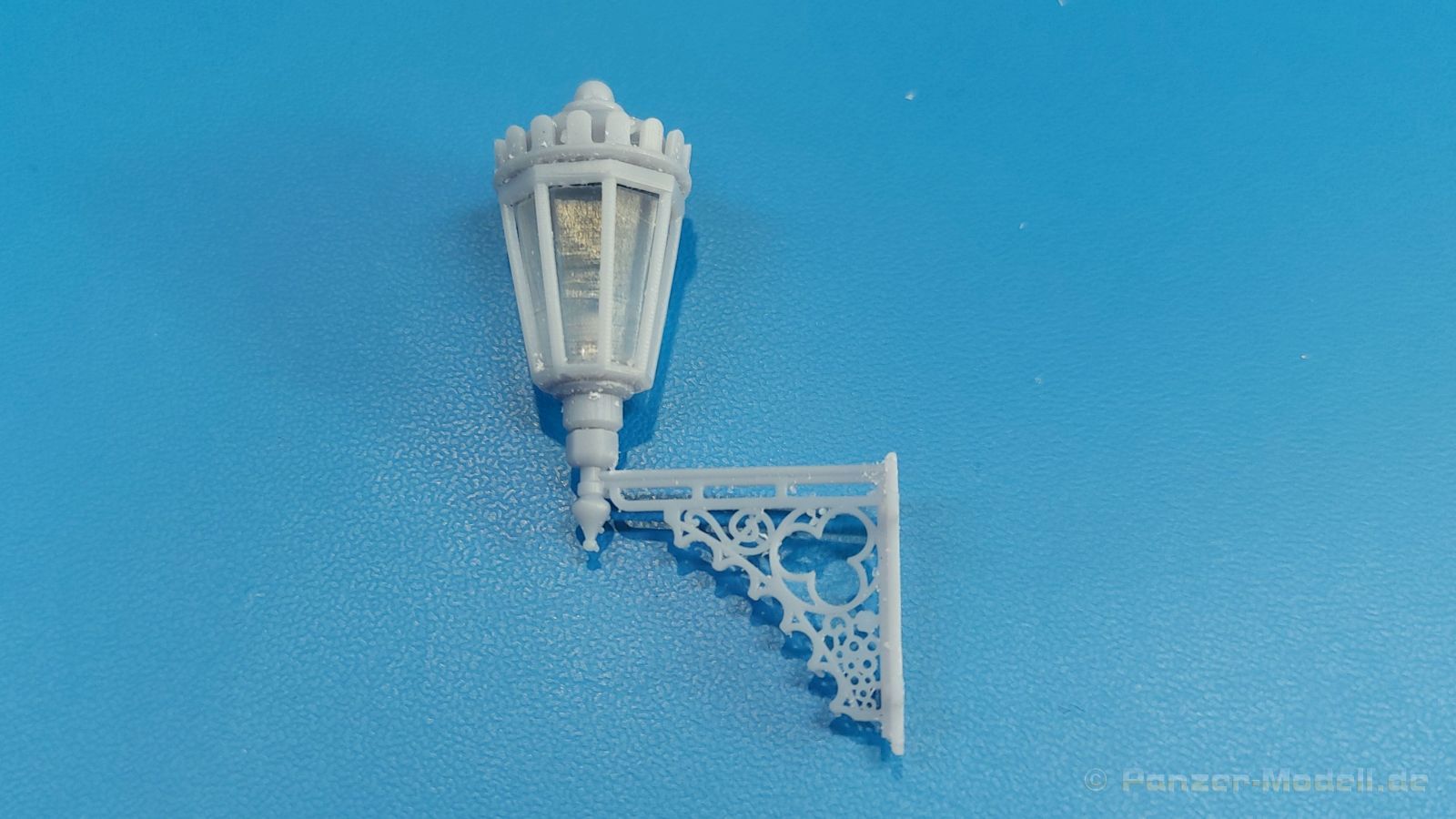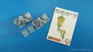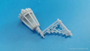 Der 3. Advent und ich habe die Lampe an. Nein, kein Glühwein-Koma, sondern schöne Lampen als Diorama Zubehör. Der 105 x 65 x 45 mm große, stabile Pappkarton enthält, durch Luftpolsterfolie geschützt, Teile für zwei 3D-gedruckte rustikale Resin-Straßenlampen, wie sie an Hauswänden montiert waren (und vielleicht immer noch sind). Der Druck ist sauber ohne Fehlstellen. Dies wird unter anderem durch viele Stützstrukturen erreicht, die zwar sehr fein sind, aber wegen der Menge und Dichte beim Abtrennen etwas Geduld erfordern. Der „Glaseinsatz“ ist auch 3D-gedruckt, aber nicht so glasklar, wie man es mittlerweile von Spritzguss kennt. Jede Lampe besteht aus einer, im Original geschmiedeten, sehr schönen Wandhalterung mit vielen Verzierungen und dem Lampenfuß mit einem zwiebelförmigen Endstück. In den achteckigen Lampenrahmen wird ein durchsichtiger Einsatz eingesetzt. Eine Klarsichtbirne wird in der Fassung am Lampenfuß eingeklebt. Nach oben schließt ein kronenförmiger Deckel die Lampe ab. Da wegen der Stützstrukturen die eigentlichen Teile nicht so gut zu sehen, habe ich die Strukturen entfernt und die Teile locker zusammengesteckt. Ein kleines, bebildertes Zettelchen in Englisch gibt zum einen Hinweise zum Arbeiten mit Resin, zeigt den Kartoninhalt und wo die Stützstrukturen abgetrennt werden sollen und wie man die Lampen zusammensetzt. Das Kartonbild zeigt die Glühbirne beleuchtet, aber dies ist mit den im Bausatz enthaltenen Teilen nicht darstellbar. Mit entsprechender Bemalung machen sie die Lampen sicherlich gut an einer Hauswand oder alternativ an einem Holzmast (den man dann aber selbst herstellen müsste). Das schöne Set ist im deutschen Handel um die 12,00 Euro erhältlich. Wir bedanken uns bei Rudi Theunissen für den Musterbausatz!