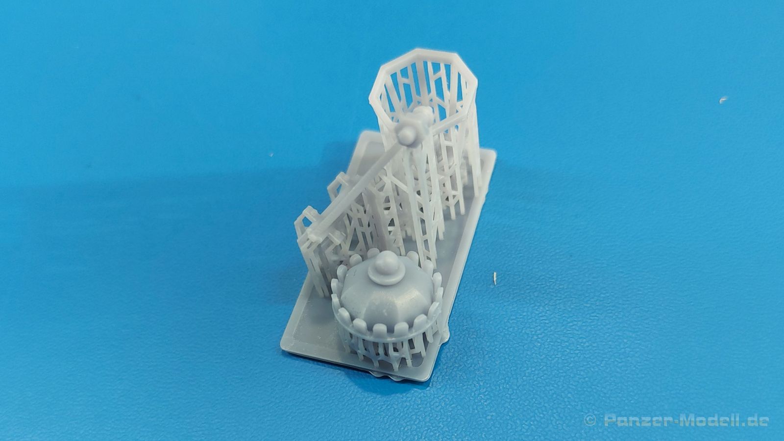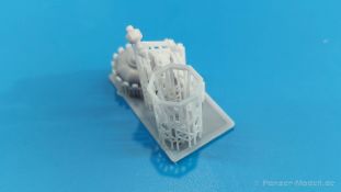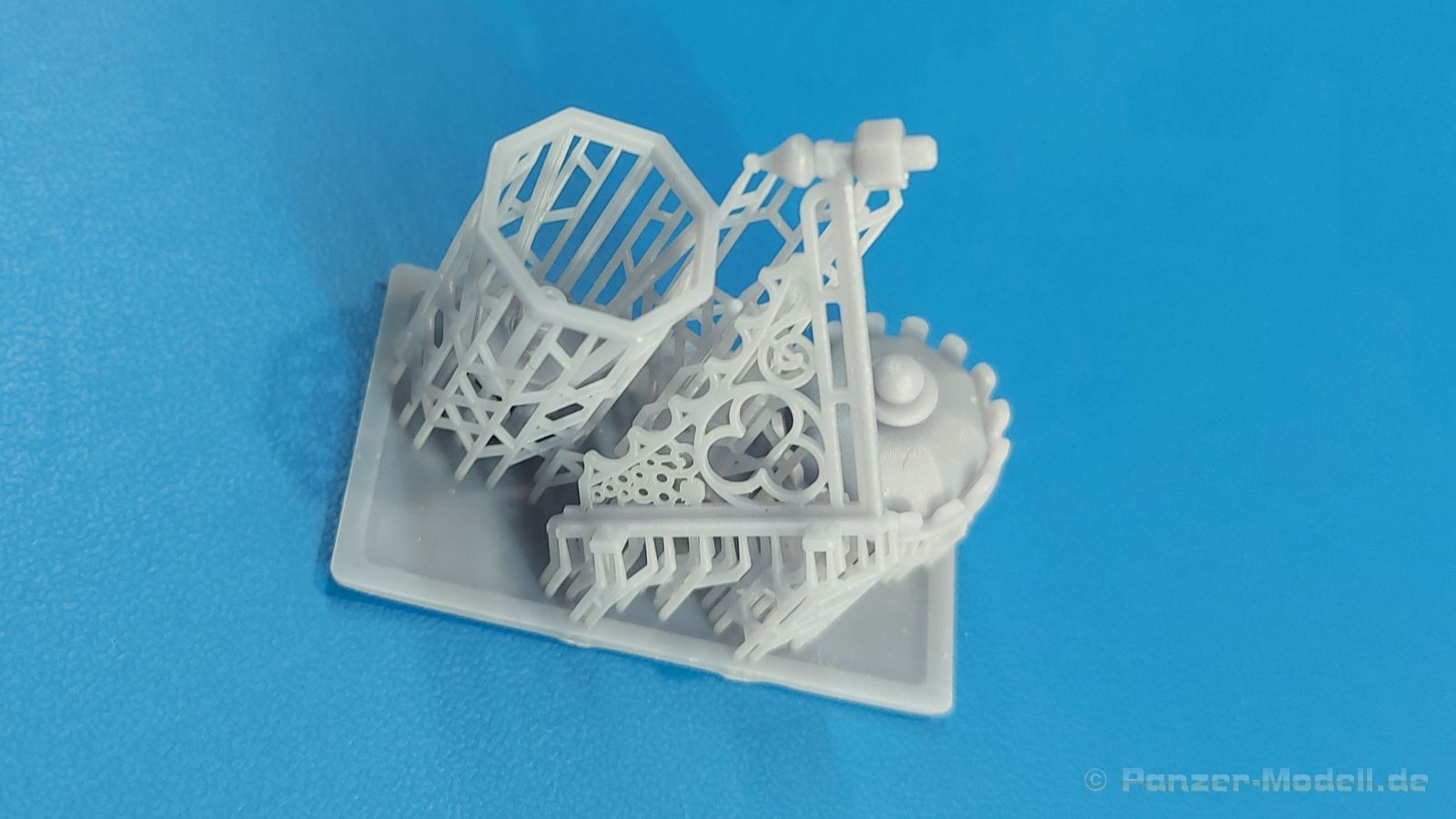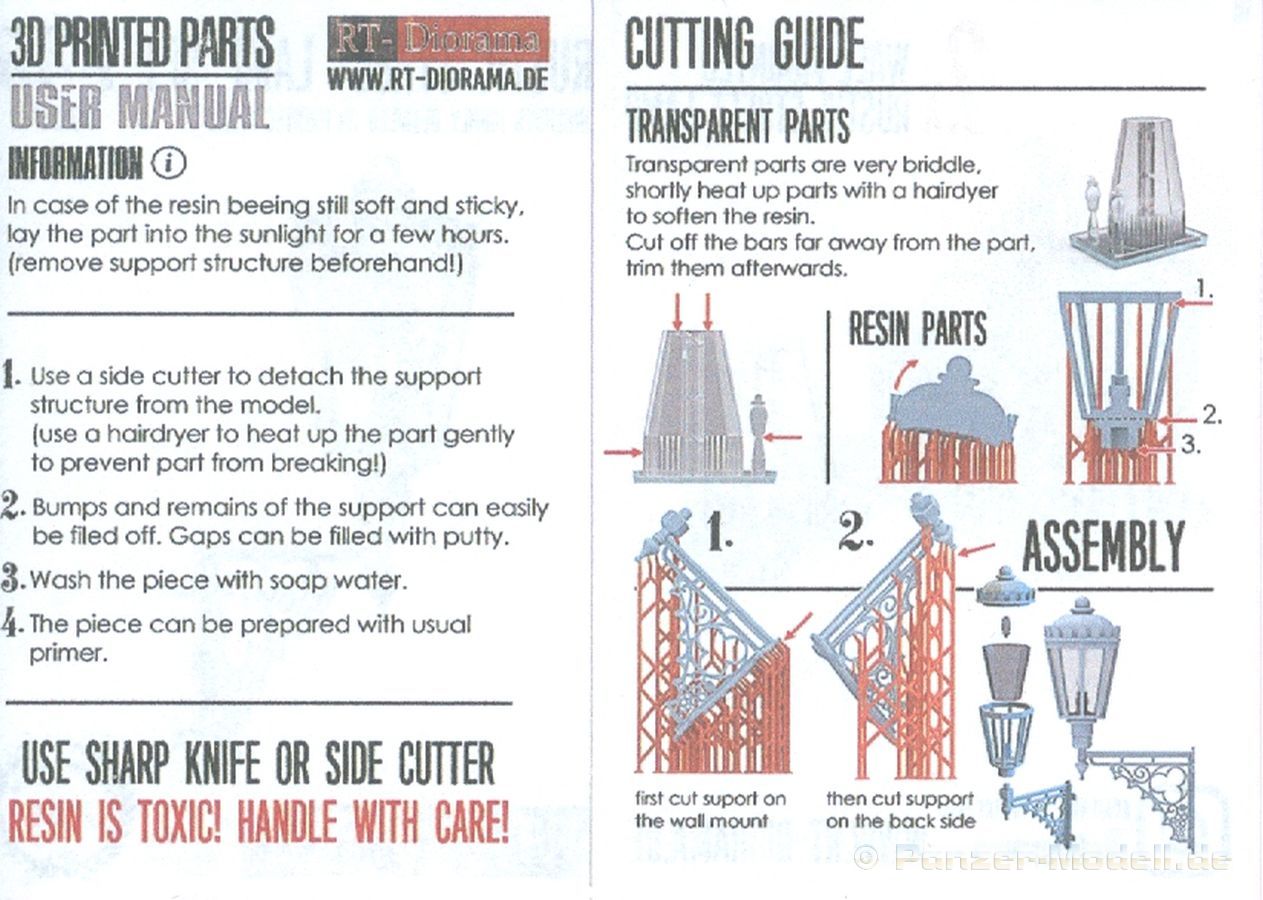 Der 3. Advent und ich habe die Lampe an. Nein, kein Glühwein-Koma, sondern schöne Lampen als Diorama Zubehör. Der 105 x 65 x 45 mm große, stabile Pappkarton enthält, durch Luftpolsterfolie geschützt, Teile für zwei 3D-gedruckte rustikale Resin-Straßenlampen, wie sie an Hauswänden montiert waren (und vielleicht immer noch sind). Der Druck ist sauber ohne Fehlstellen. Dies wird unter anderem durch viele Stützstrukturen erreicht, die zwar sehr fein sind, aber wegen der Menge und Dichte beim Abtrennen etwas Geduld erfordern. Der „Glaseinsatz“ ist auch 3D-gedruckt, aber nicht so glasklar, wie man es mittlerweile von Spritzguss kennt. Jede Lampe besteht aus einer, im Original geschmiedeten, sehr schönen Wandhalterung mit vielen Verzierungen und dem Lampenfuß mit einem zwiebelförmigen Endstück. In den achteckigen Lampenrahmen wird ein durchsichtiger Einsatz eingesetzt. Eine Klarsichtbirne wird in der Fassung am Lampenfuß eingeklebt. Nach oben schließt ein kronenförmiger Deckel die Lampe ab. Da wegen der Stützstrukturen die eigentlichen Teile nicht so gut zu sehen, habe ich die Strukturen entfernt und die Teile locker zusammengesteckt. Ein kleines, bebildertes Zettelchen in Englisch gibt zum einen Hinweise zum Arbeiten mit Resin, zeigt den Kartoninhalt und wo die Stützstrukturen abgetrennt werden sollen und wie man die Lampen zusammensetzt. Das Kartonbild zeigt die Glühbirne beleuchtet, aber dies ist mit den im Bausatz enthaltenen Teilen nicht darstellbar. Mit entsprechender Bemalung machen sie die Lampen sicherlich gut an einer Hauswand oder alternativ an einem Holzmast (den man dann aber selbst herstellen müsste). Das schöne Set ist im deutschen Handel um die 12,00 Euro erhältlich. Wir bedanken uns bei Rudi Theunissen für den Musterbausatz!