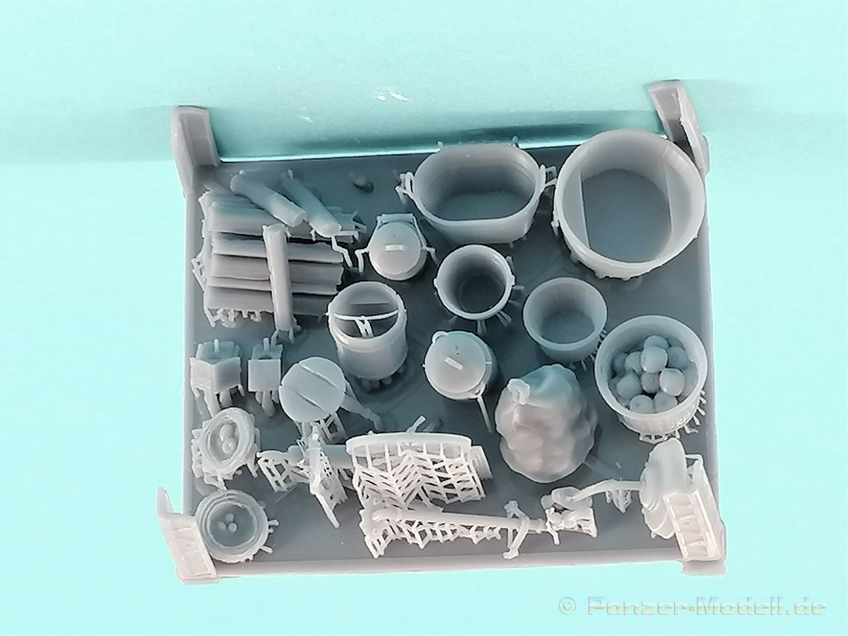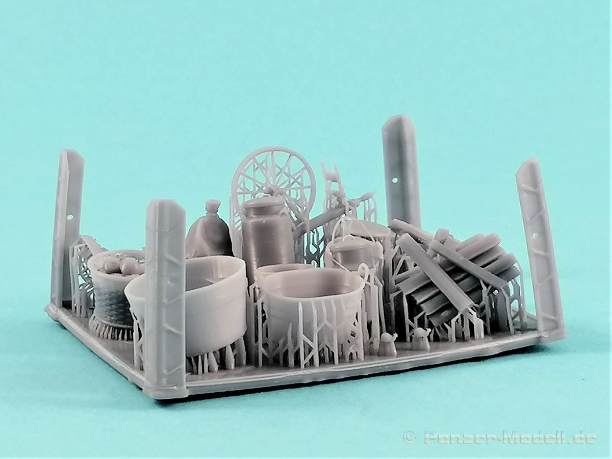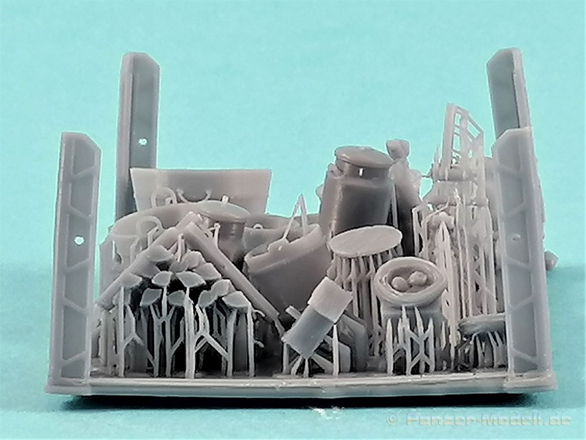 Zubehör für den Bauernhof… Aber nicht nur… Rund 20 Teile befinden sich auf zwei Grundplatten. Alles trefflich in einer stabilen Kartonbox geschützt. Vorhanden sind u.a.: Ein Strohbesen, eine Forke (Mistgabel), eine Sense, ein Spaten, ein Spinnrad und ein Holzstapel. Weiter gibt es einen runden Holzbottich, einen Zuber aus Zink und verschiedene Eimer in unterschiedlichen Zuständen (mit und ohne Henkel). Dazu kommen zwei Weidenkörbe, wobei einer davon mit Äpfeln (?) gefüllt ist. Milchkannen sind ebenfalls zu entdecken. Vorhanden ist auch ein Melkschemel sowie ein Kartoffelsack. Ein Wasseranschluß direkt für die Hauswandmontage wurde ebenfalls realisiert. Doch damit nicht genug. Auch zwei Vogelhäuschen und zwei nach oben hin offene Nester mit Inhalt haben ihren Weg aus dem Drucker gefunden. Ebenfalls im Set enthalten ist eine Lampe zur Wandmontage. Diese hat zum Schutz des Leuchtkörpers vor diesem ein Drahtgeflecht und ist extrem filigran gedruckt. Erste Sahne! Raster, offensichtliche Druckfehler oder Schichten sind keine zu finden und offenbaren einen erstklassige Druck. Alles ist detailreich und zum Teil sehr filigran. Zeit sollte man einplanen um die Supports von den Bauteilen zu lösen. Herausfordernd dürfte das wohl bei den Speichen des Spinnrads und den Henkeln der Eimer sein. Ein Set für das ich eine Kaufempfehlung aussprechen kann, wobei der Preis schon am oberen Ende angesiedelt ist. Wie immer der Tipp am Rande: Vor der Ver- und Bearbeitung der Teile das Set ein paar Tage auf die Fensterbank (nicht in die pralle Sonne) stellen falls das Resin doch noch nicht ganz ausgehärtet ist.