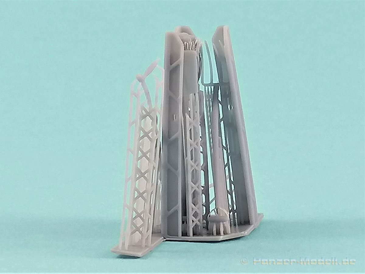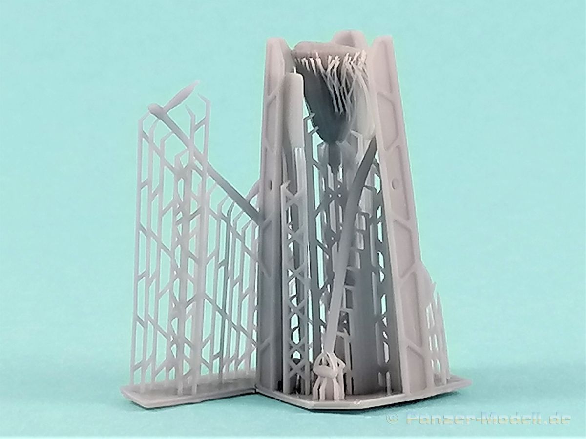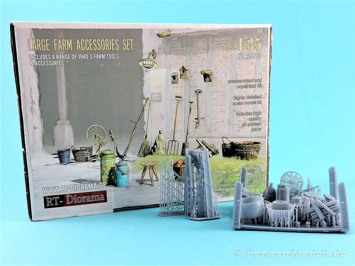 Zubehör für den Bauernhof… Aber nicht nur… Rund 20 Teile befinden sich auf zwei Grundplatten. Alles trefflich in einer stabilen Kartonbox geschützt. Vorhanden sind u.a.: Ein Strohbesen, eine Forke (Mistgabel), eine Sense, ein Spaten, ein Spinnrad und ein Holzstapel. Weiter gibt es einen runden Holzbottich, einen Zuber aus Zink und verschiedene Eimer in unterschiedlichen Zuständen (mit und ohne Henkel). Dazu kommen zwei Weidenkörbe, wobei einer davon mit Äpfeln (?) gefüllt ist. Milchkannen sind ebenfalls zu entdecken. Vorhanden ist auch ein Melkschemel sowie ein Kartoffelsack. Ein Wasseranschluß direkt für die Hauswandmontage wurde ebenfalls realisiert. Doch damit nicht genug. Auch zwei Vogelhäuschen und zwei nach oben hin offene Nester mit Inhalt haben ihren Weg aus dem Drucker gefunden. Ebenfalls im Set enthalten ist eine Lampe zur Wandmontage. Diese hat zum Schutz des Leuchtkörpers vor diesem ein Drahtgeflecht und ist extrem filigran gedruckt. Erste Sahne! Raster, offensichtliche Druckfehler oder Schichten sind keine zu finden und offenbaren einen erstklassige Druck. Alles ist detailreich und zum Teil sehr filigran. Zeit sollte man einplanen um die Supports von den Bauteilen zu lösen. Herausfordernd dürfte das wohl bei den Speichen des Spinnrads und den Henkeln der Eimer sein. Ein Set für das ich eine Kaufempfehlung aussprechen kann, wobei der Preis schon am oberen Ende angesiedelt ist. Wie immer der Tipp am Rande: Vor der Ver- und Bearbeitung der Teile das Set ein paar Tage auf die Fensterbank (nicht in die pralle Sonne) stellen falls das Resin doch noch nicht ganz ausgehärtet ist.
