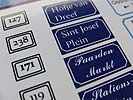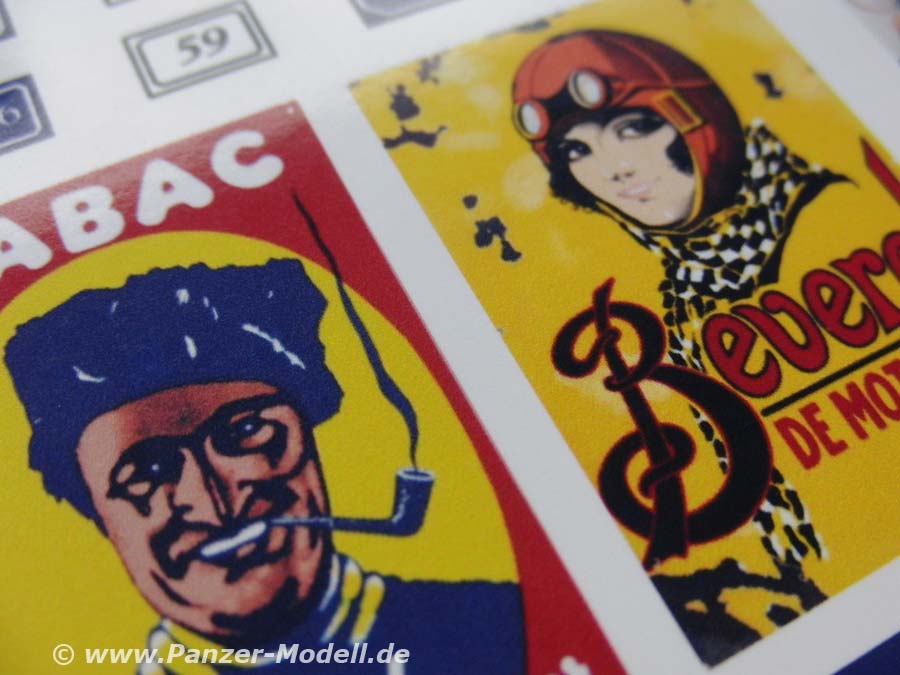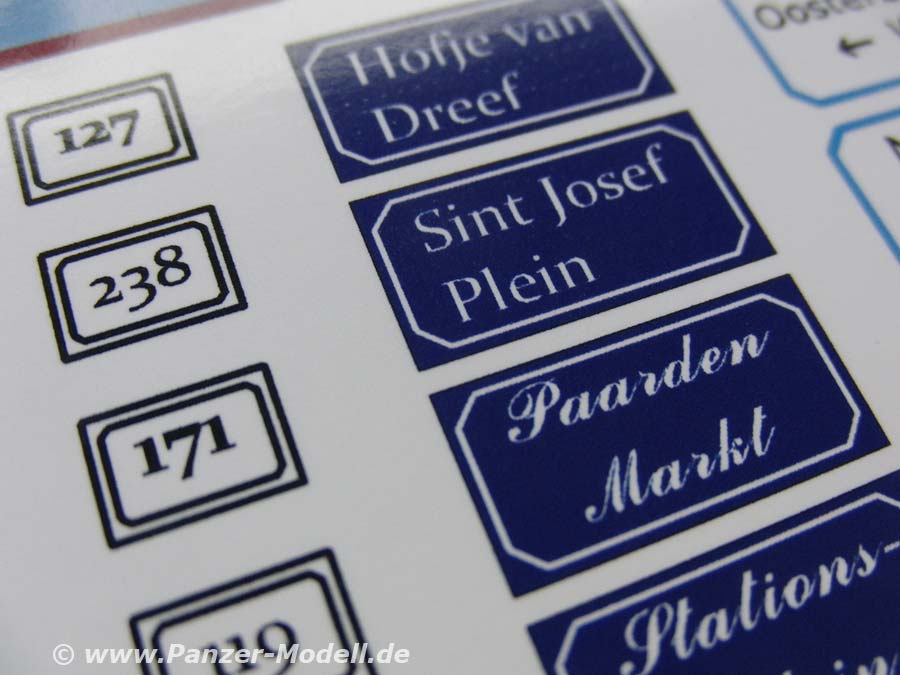 Auf dem Bogen sind 14 Schilder für Shops und Werbeplakate, sowie fast 40 Straßenschilder, Hausnummern und Ortsschilder.