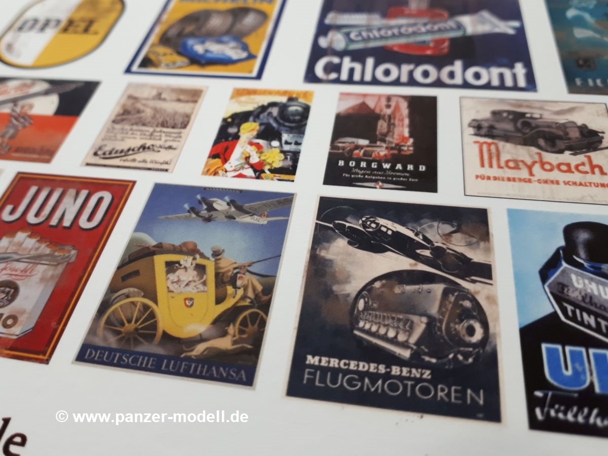 Der schneeweiße A5 Bogen aus dünner Pappe enthält in verschiedenen Größen, Farben und Formen Werbeplakate und Schilder größtenteils auch noch heute bekannter deutscher Firmen und Marken. Es wird fast nichts ausgelassen Werbung für Tinte, Elektrogeräte, Automobilwerke, Reifen, Luftfahrtfirmen, Zigaretten, Süßigkeiten, Waschmittel, Zahncreme und andere Haushaltsmittel.