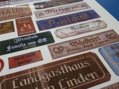 Dieser Bogen enthält Schilder von deutschen Hotels, Geschäften und anderen Örtlichkeiten in verschiedensten Farben, Größen und Formen. Ein paar Plakate und Verkehrszeichen sind auch dabei.