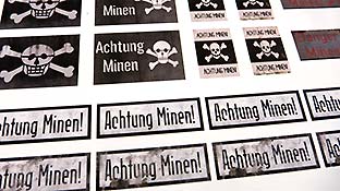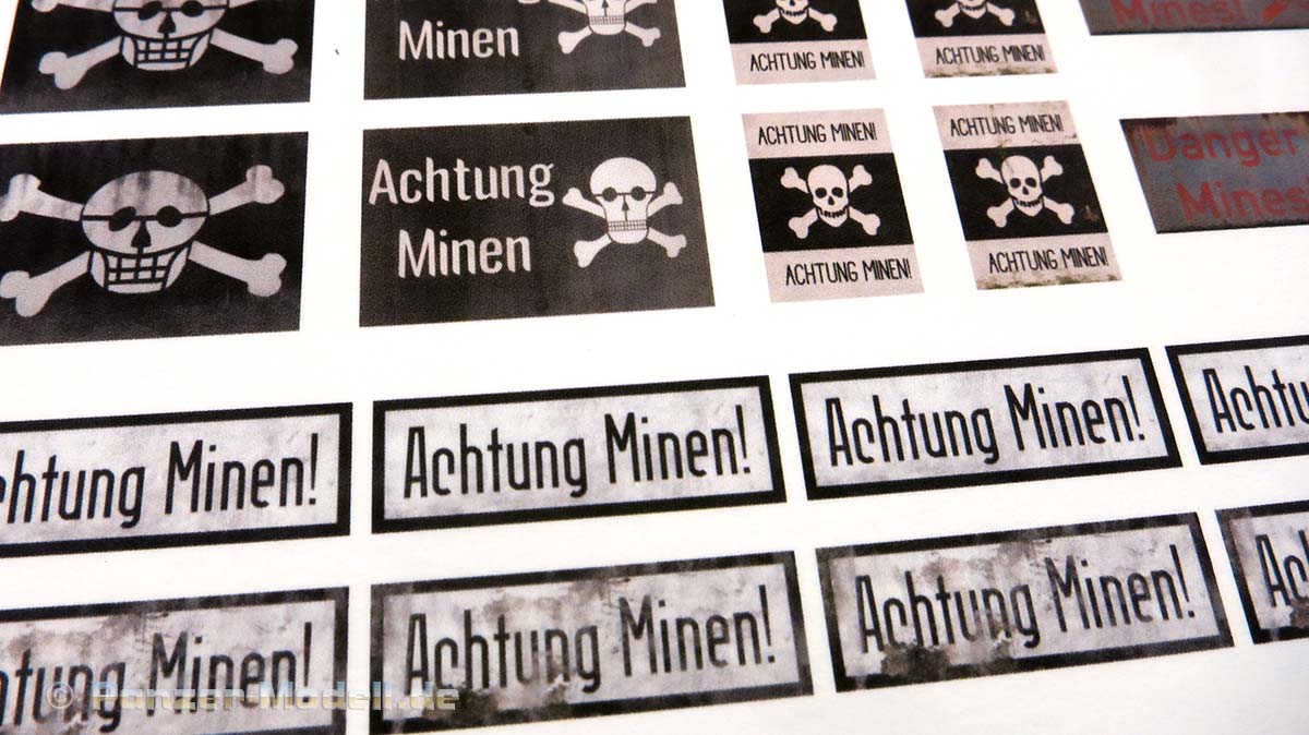 Desweiteren gibt 13 verschiedene Warnschilder zu Minen - diese dann in mehrfacher Ausführung und hauptsächlich in deutscher Sprache, aber auch andere Sprachen sind enthalten, sodass das Set nicht nur für Dioramen mit deutscher Beteiligung geeignet ist, sonder auch für andere. Sehr vorbildlich.