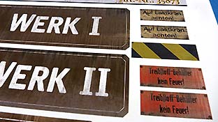 Dieses Set gehört ebenfalls, wie alle neuen und alten überarbeiteten Sets, zu den pre-weathered Sets, d.h. im Druck sind die Schilder bereits mit Verwitterung gedruckt, also Schmutzflecken, Regenlaufspuren, Roststriemen, usw. Das erspart einem das die Arbeit des Alterns der Schilder, insbesondere da Papier meist nicht gut auf Washinglösungen reagiert.