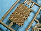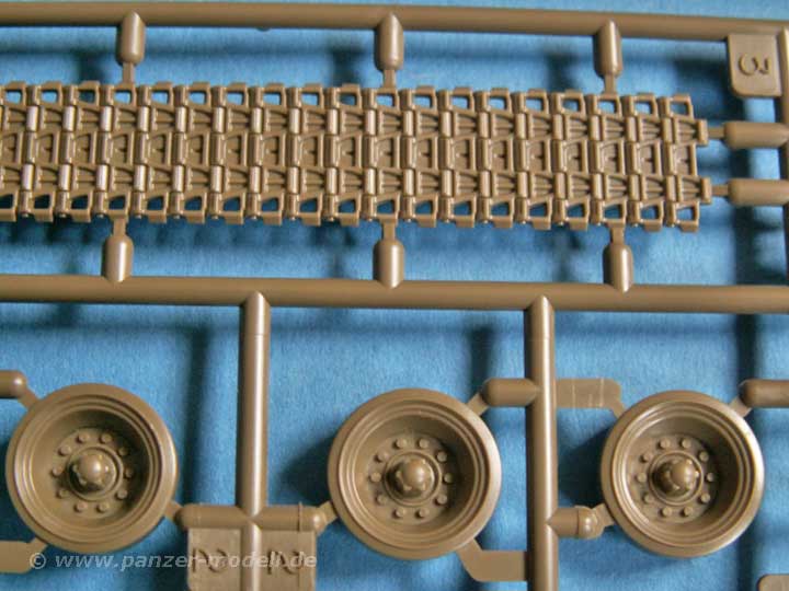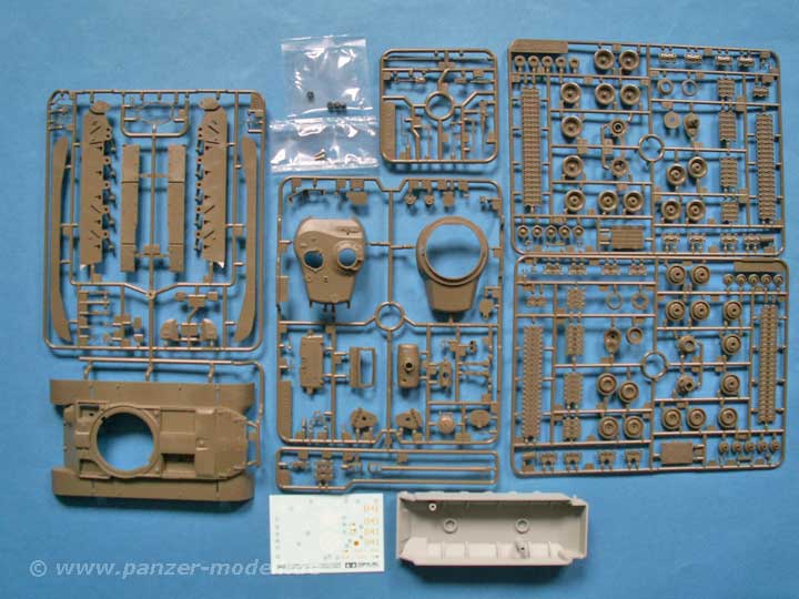 DIe Spritzgussteile sind mit feinen Details versehen und besonders bemerkenswert ist der Turm, der eine dermaßen feine und realistische Gussstruktur aufweist, dass es die helle Freude ist! Auch die übrigen Teile sind sehr schön gestaltet. Die Kette ist aus mehreren Segmenten zusammenzubauen, Das Laufwerk mit den Schwingarmen als komplett Seitenteil zum aufkleben auf die Metallwanne. Der Decalbogen macht einen guten Eindruck.