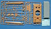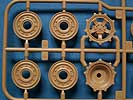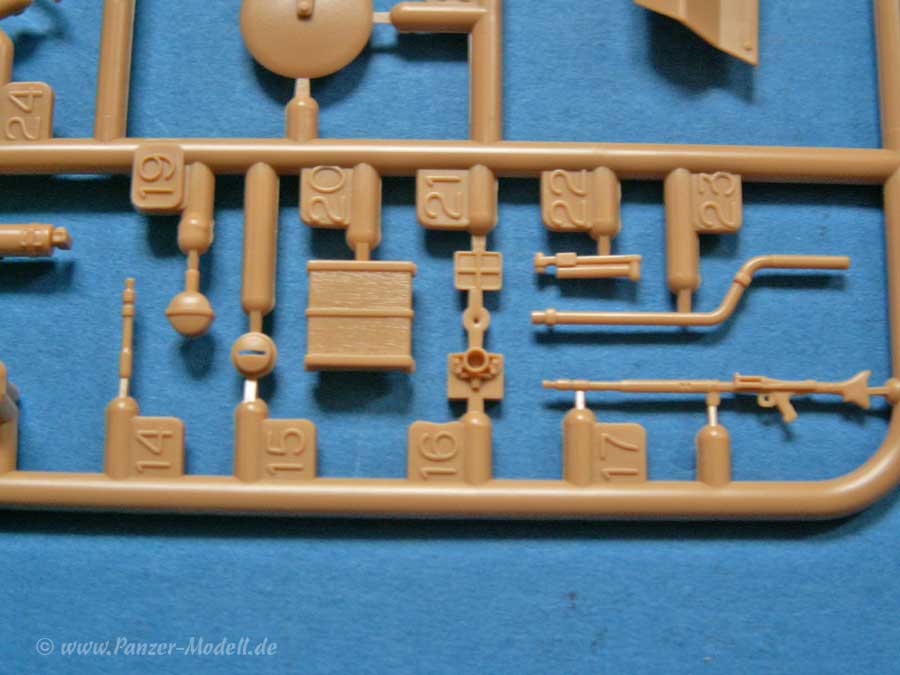 Wie mittlerweile in dieser Reihe gewohnt, finden sich hier bemerkenswert gut detailierte Teile mit schönen Details. Dss Treibrad ist vom Typ mit den 9 Zähnen, und die Kette entsprechend zweiteilig in verschieden langen Segmenten. Gerade im Bereich des Laufwerks zeigen sich besonders gute Qualitäten. Aber auch der Turm und die lange Kanonen sind sehr schön dargestellt. Das Motordeck verfügt zwar über eine Vertiefung für einen Motor, der ist aber leider nicht enthalten.