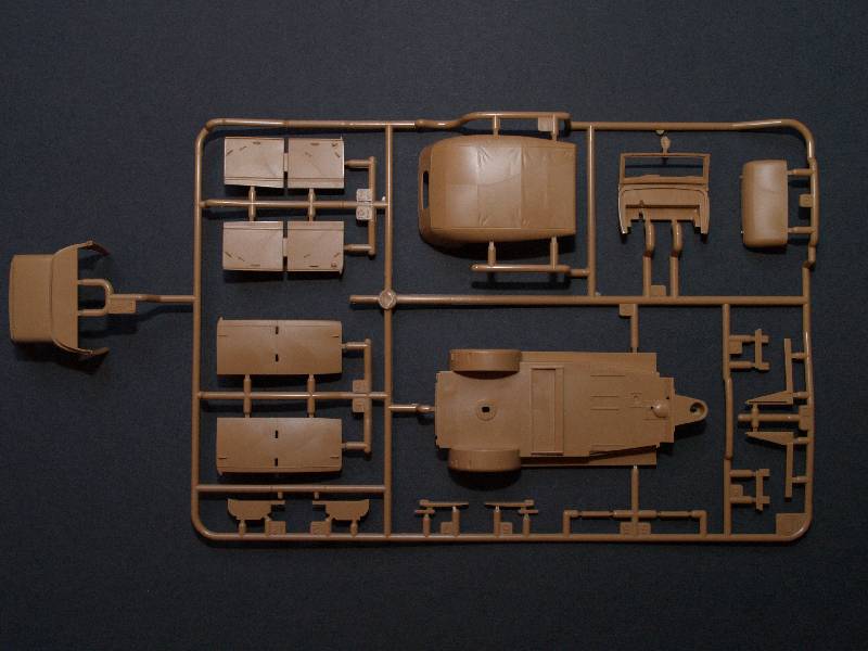 Enthalten sind 3 Spritzlinge auf beigefarbenen Plastik, ein Spritzling aus transparenten Plastik, der Fahrzeugrahmen aus Metall und ein Decalbogen.