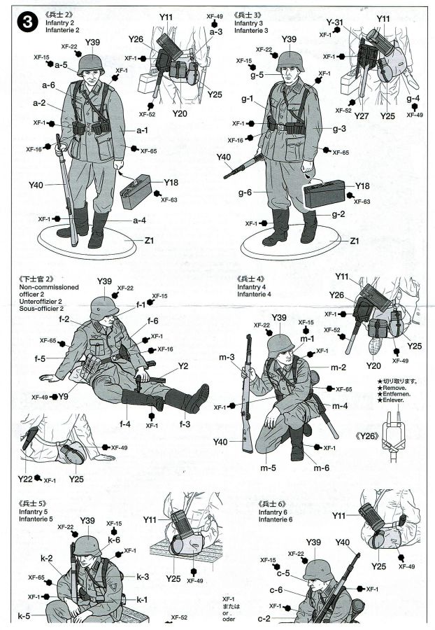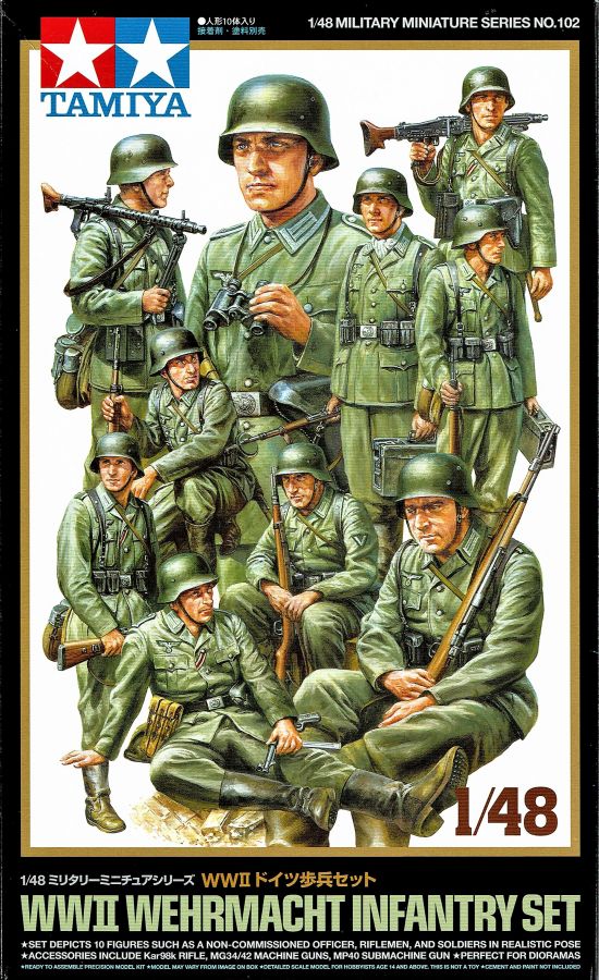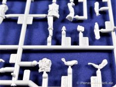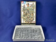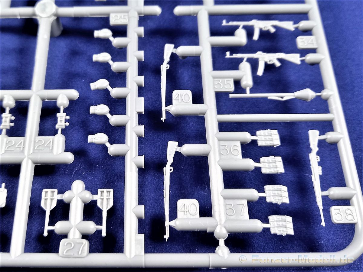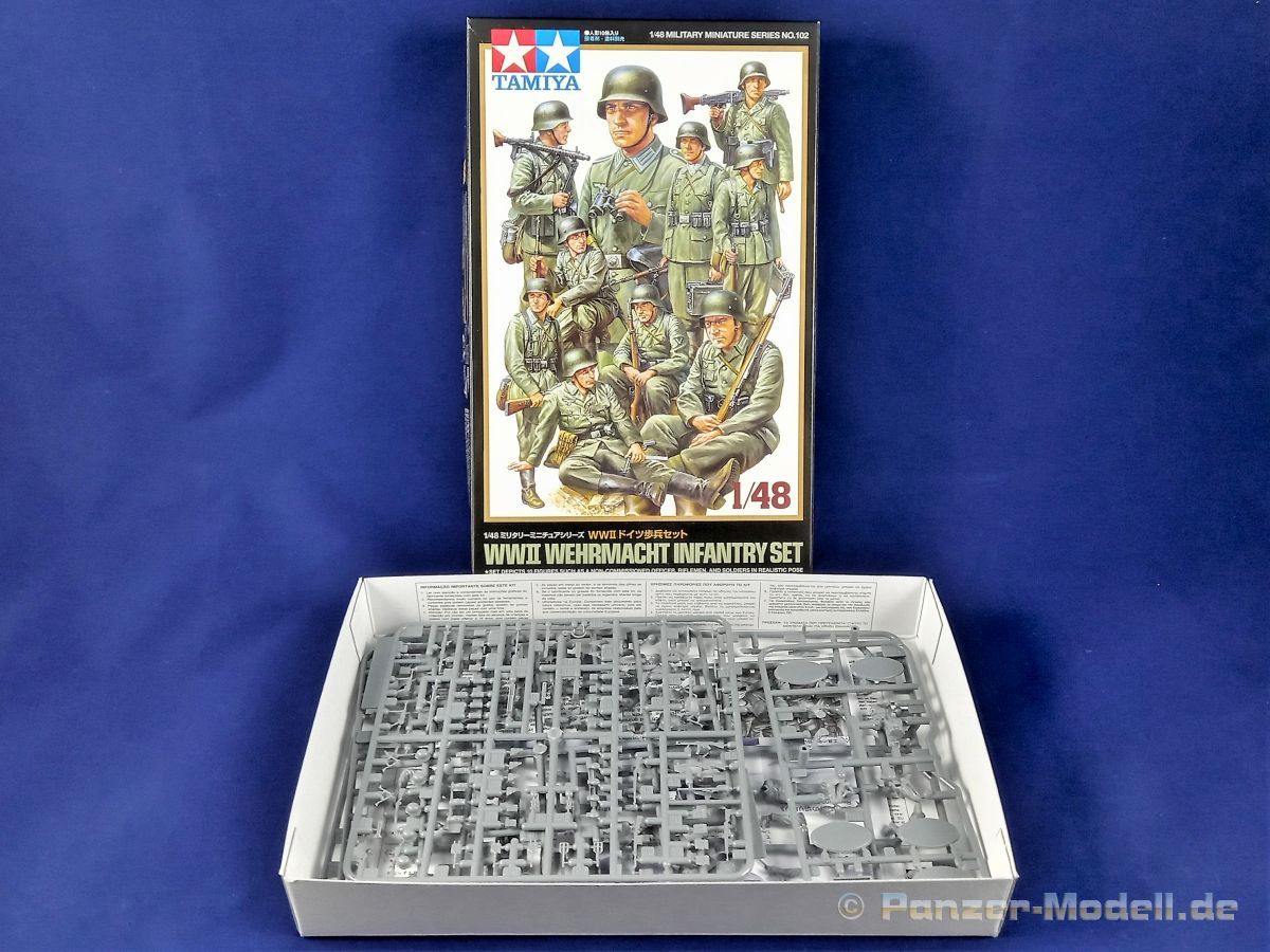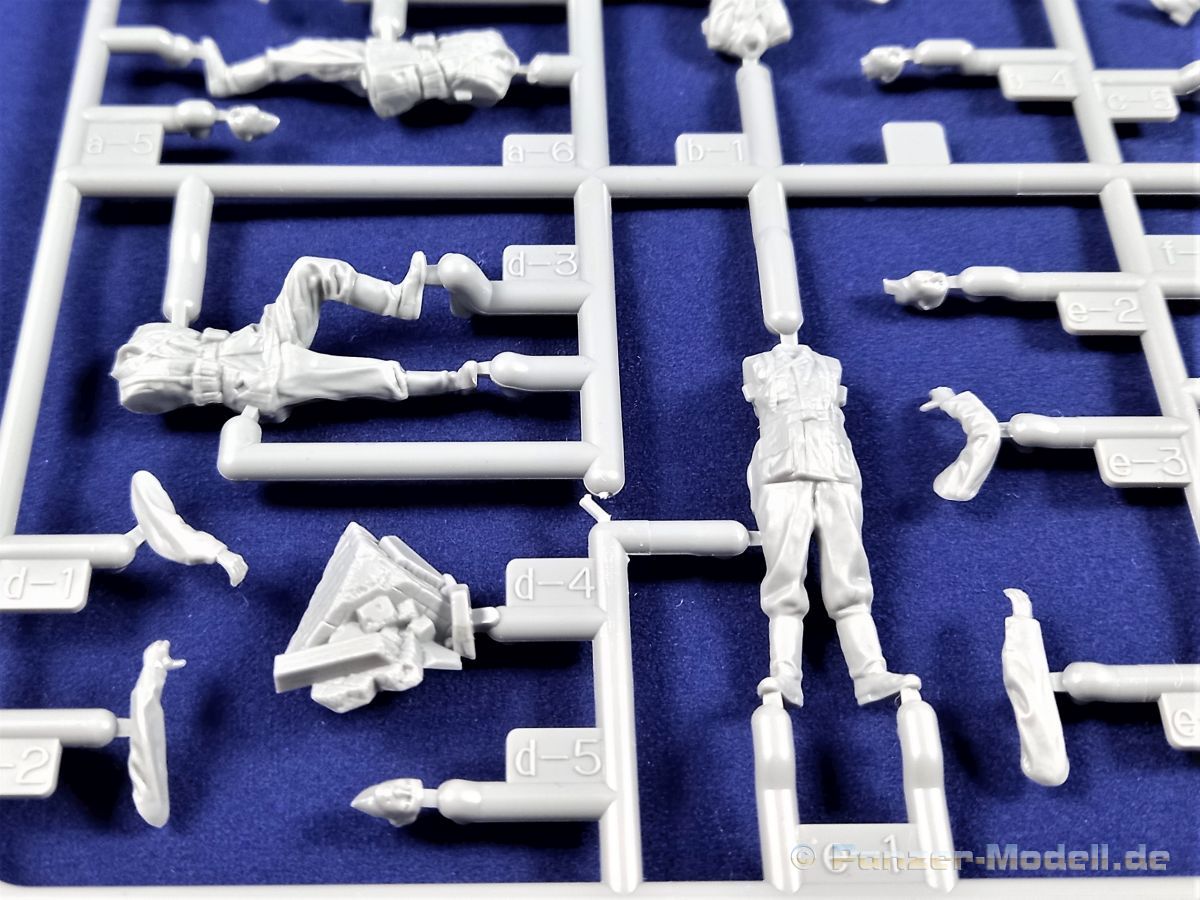 Sehen wir uns einmal den neuesten Streich, res. die Figuren von Tamiya genauer an. Insgesamt zehn Figuren werden hier laut Kartoninfo geboten. In der für den 1:48er Maßstab typischen Stülpschachtel befinden sich insgesamt vier Rahmen aus hellgrauem Plastik, ein Faltblatt mit Tips und ein weiteres Faltblatt für den Zusammenbau der Soldaten. Zwei davon halten die Teile der Figuren während sich auf zwei identischen Rahmen alle relevanten Ausrüstungsteile befinden. Die einzelnen Spritzlinge sehen ausgezeichnet aus. Sauberer Guß, weder Fischhaut noch Grat. Zu bauen gibt es die schon angesprochenen zehn Figuren die der Infanterie zuzuordnen sind. Obwohl zeitlich in der Mitte des Krieges einzuordnen sind die Figuren recht universell einsetzbar. Für diesen Maßstab sind die Figuren ganz ausgezeichnet reproduziert. Realistischer Faltenwurf, sehr gute entspannte und relaxte Posen; stehend und sitzend. Die Uniformen sind sehr schön durchgestaltet, mit aufgesetzten Taschen, Koppel und Schulterstücken. Auch die Köpfe wissen für Spritzguß durchaus zu gefallen. Als Zubehör findet sich im Bausatz eine große Anzahl an persönlicher Ausrüstung und Waffen für die Infanteristen. Stahlhelme (ein paar Feldmützen wären schön gewesen), Gasmaskenbehälter, Feldflaschen, Essgeschirr, Spaten und einiges mehr. An Waffen gibt es zwei MG 34 und MG 42, verschiedene Karabiner, Panzerfäuste, MPs und Munitionskästen. Das alles tadellos umgesetzt. Dazu kommen noch Grundplatten für die stehenden Figuren, eine Kiste und ein Mauerstück für die sitzenden Kameraden. Einiges davon wird wohl in der Grabbelkiste landen. Die Bauanleitung verfügt über je eine Baustufe für jede Figur die keine Fragen offen läßt. Die Farbangaben beziehen sich auf die hauseigenen Farbtöne. Leider gibt es für die Abzeichen etc. keine Decals. Gute Augen, eine ruhige Hand und ein feiner Pinsel sind eventuell gefragt… Unter‘m Strich: Ein schöner Figurenbausatz, ideal für Dioramen. Wer entsprechende Infanteriefiguren in universeller Pose sucht wird hier sicher fündig.
