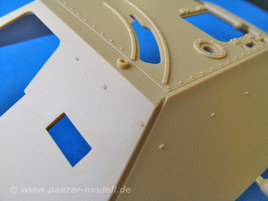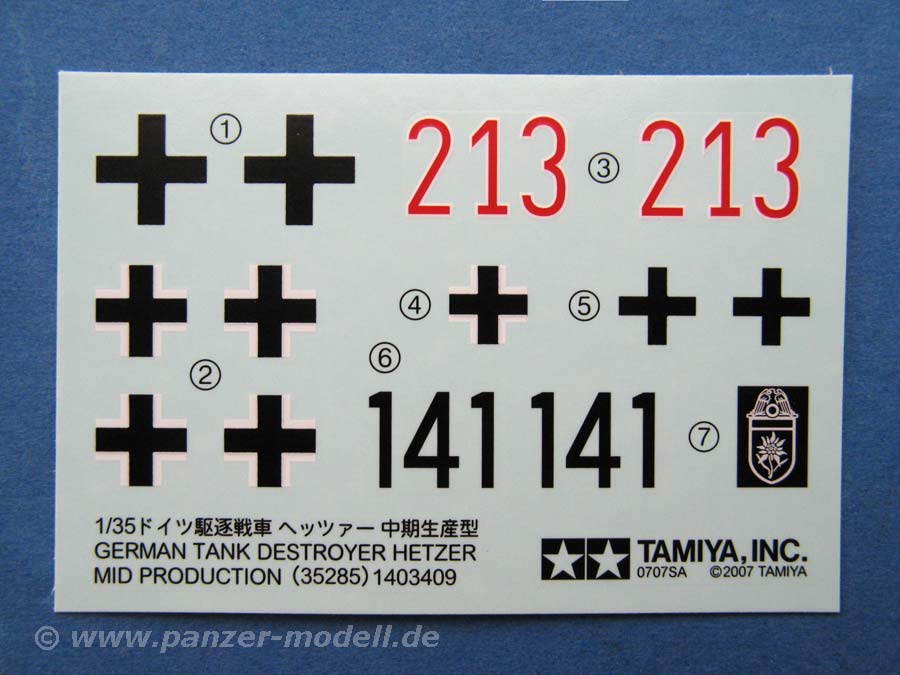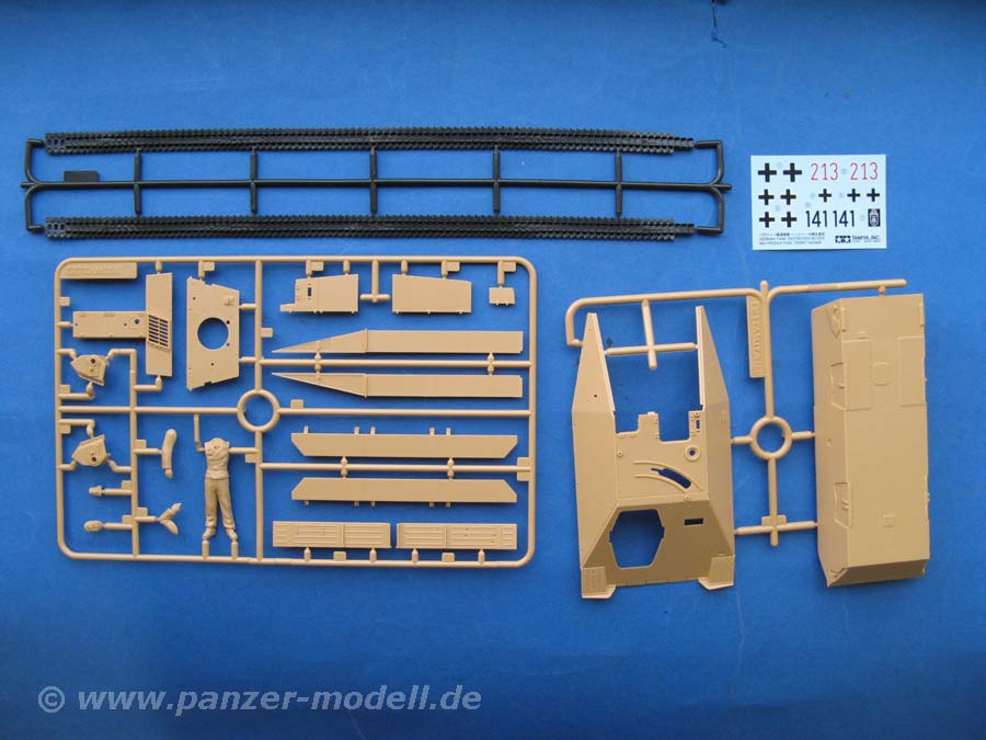 Im Vertrieb von Dickie-Tamiya Mit der Nummer 35285 bringt Tamiya einen Jagdpanzer 38(t) Hetzer der mittleren Produktion.Im Karton finden sich insgesamt 5 Spritzlinge, dazu Vinylketten und ein Decalbogen. Die Qualität der Teile ist we von Tamiya gewohnt hervorragend und die Passgenauigkeit exzellent. Die Detailierung weiss zu gefallen, denn es finden sich fein strukturierte Schnittflächen der Panzerplatten und ganz feine Gussstruktur der Kanonenblende und -erker. Neben der schön gemachten Vinylkette liegt eine Kette aus Spritzguss bei, die aus einzelnen Kettengliedern und längeren Stücken besteht. Die oberen Kettenteile bestehen aus bereits leicht durchhängenden Kettengliedern - schöne Sache, obwohl man später hinter den Schürzen diese nicht sehen kann. Treibrad, Leitrad und Laufrollen sind vom korrekten Typ und schön detailiert. Die Kanone wird von einem raffinierten System von Polycaps gehalten, sodass dieses in alle Richtungen beweglich bleibt. Das Rohr ist erfreulicherweise in einem Stück und nicht wie gewohnt aus Halbteilen gefertigt. Erfreulicherweise liegt ebenfalls eine Figur bei, was heutzutage nicht immer selbstverständlich ist. Die Bauanleitung ist wie immer sauber und verständlich ausgeführt Hier zahlt sich die jahrzehntelange Erfahrung von Tamiya aus. Neben der Bauanleitung findet sich eine bunt gedruckte Bemalungsanleitung auf 4 DIN A4 Seiten. Als Varianten werden angeboten: - 17.Armee, Tschechien, Mai 1945 in Hinterhalttarnung - 2./Pz.Jg.Abt. 744, 1.Pz.Armee, Nové Mesto, Tschechien, Sommer 1945 in Dreifarbtarnung - 1./Geb.Pz.Jg.Abt.95, 3.Geb.jg.Div., Tatragebirge, Tschechien, Januar 1945 in Wintertarnung - StuG Abt.1708, 708.Volksgrenadierdivision, Halloville, Frankreich, November 1945 in Hinterhalttarnung. Insgesamt ein schönes Modell, das auch von Anfängern schnell und problemlos gebaut werden kann - Modellbauspaß pur. Kostenpunkt knapp 37 Euro. Das Modell ist bei dem Modellbaufachhändler eures Vertrauens zu bekommen. |