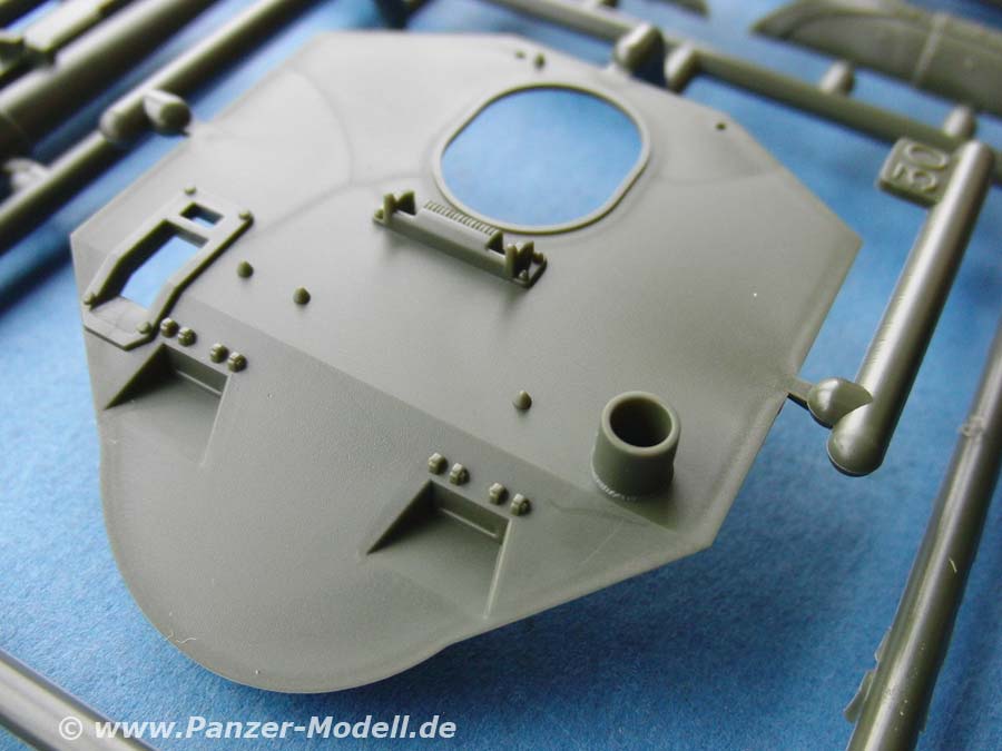 Der Turm ist komplett neu und setzt sich aus mehreren Teilen zusammen - diese machen ebenfalls einen sehr guten Eindruck. Die wuchtige Kanone ist leider als Halbteil ausgeführt, weist aber dafür eine recht schöne einteilige Mündzngsbremse mit Bohrungen auf - diese sind zwar nicht durchgeführt, lässt sich aber sicher recht einfach vom geübten Modellbauer nacharbeiten. Die Kanone bleibt beim Einbau in den Turm höhenrichtbar. Der Turm weist rudimentäre Inneinrichtung auf und die Luken lassen sich auch offen darstellen.