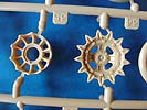 Die Qualität der Teile ist wie von Tamiya gewohnt sehr gut und vor allem sehr sauber. Die Laufrollen und Treib/Leitrad bleiben dank Polycaps beweglich und die Schwingarme werden einzeln in die Wanne eingesteckt. Die Ketten sind einteilige Vinylketten, die von der Qualität her gut und recht schön detailliert sind. Und es finden sich hier keine fiesen Auswerfermarken, weder auf der Innen- noch der Aussenseite. Lediglich die verpackung im Karton führt oft dazu dass diese Ketten in der Mitte geknickt oder verdreht sind - diese Torsionen muss man erstmal wieder rauskriegen.