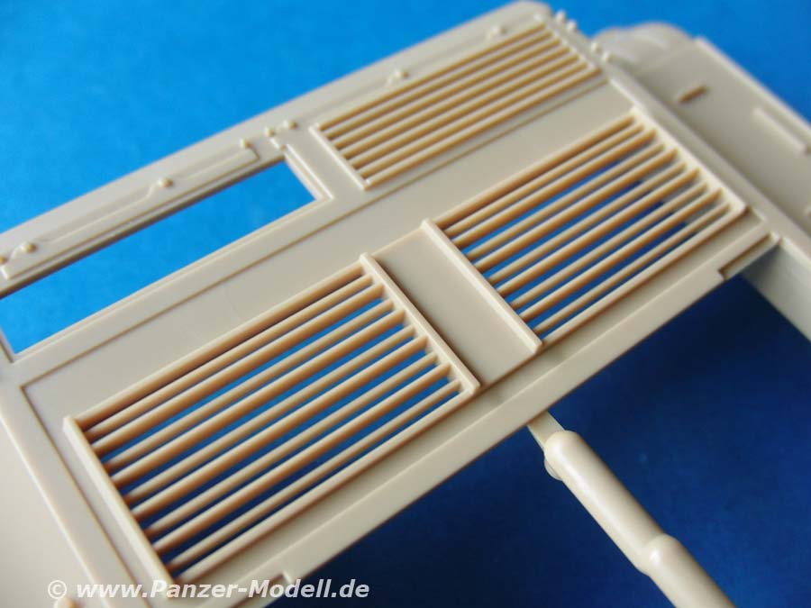 Die Oberwanne stellt die korrekten Details für die IDF Version mit geänderten Kettenblenden und der großen Staukiste am Heck dar. Die Motorlüftergitter werden mit dem beiliegenden Gittermaterial dargestellt, das nach Vorlage in der Bauanleitung ausgeschnitten werden muss.