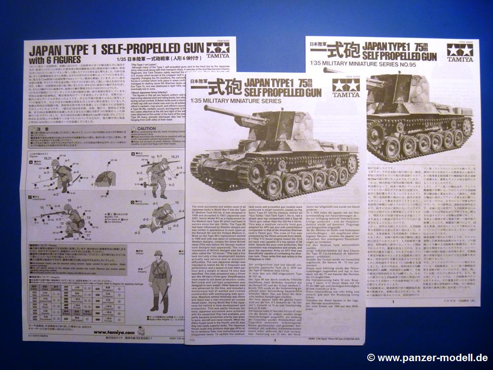 Der Zusammenbau und Bemalung der Figuren wird auf einem separaten, japanisch-englischem A4 Blatt angegeben, welches sich auf den kompletten Bausatz bezieht. Eine kurze Beschreibung des Type 1 (Ho-Ni 1) beim Einsatz auf Luzon und Informationen über japanische Infantrie findet sich am Anfang. Dem folgt die Anleitung zum Bau der Figuren. Hierbei werden die fertigen Figuren dargestellt mit Nummernhinweisen, wo die einzelnen Teile hingehören. Dazu kommt die Benennung der Rangabzeichen. Der Hinweis, dass man die Ketten auch kleben kann, geht etwas unter. Man entdeckt ihn nur, wenn man die Anleitungen vor dem Bau wirklich gründlich studiert.