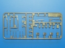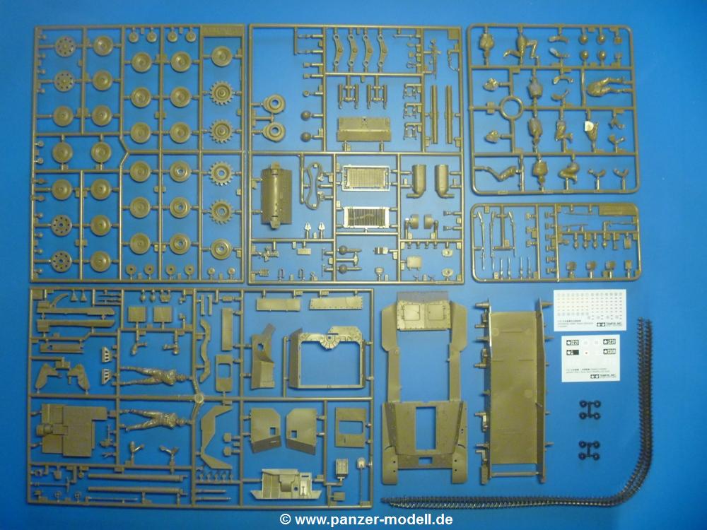 Der Inhalt, verpackt in verschiedene Klarsichtbeutel, besteht aus 3 olivgrünen Spritzlingen, 2 Vinylketten und 2 Spritzlingen mit Vinylbuchsen, sowie Ober- und Unterwanne für das eigentliche Fahrzeug. Dazu kommen 2 ebenfalls olivgrüne Spritzlinge für die zusätzlich enthaltene Figuren und deren Ausrüstung.