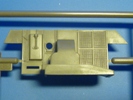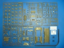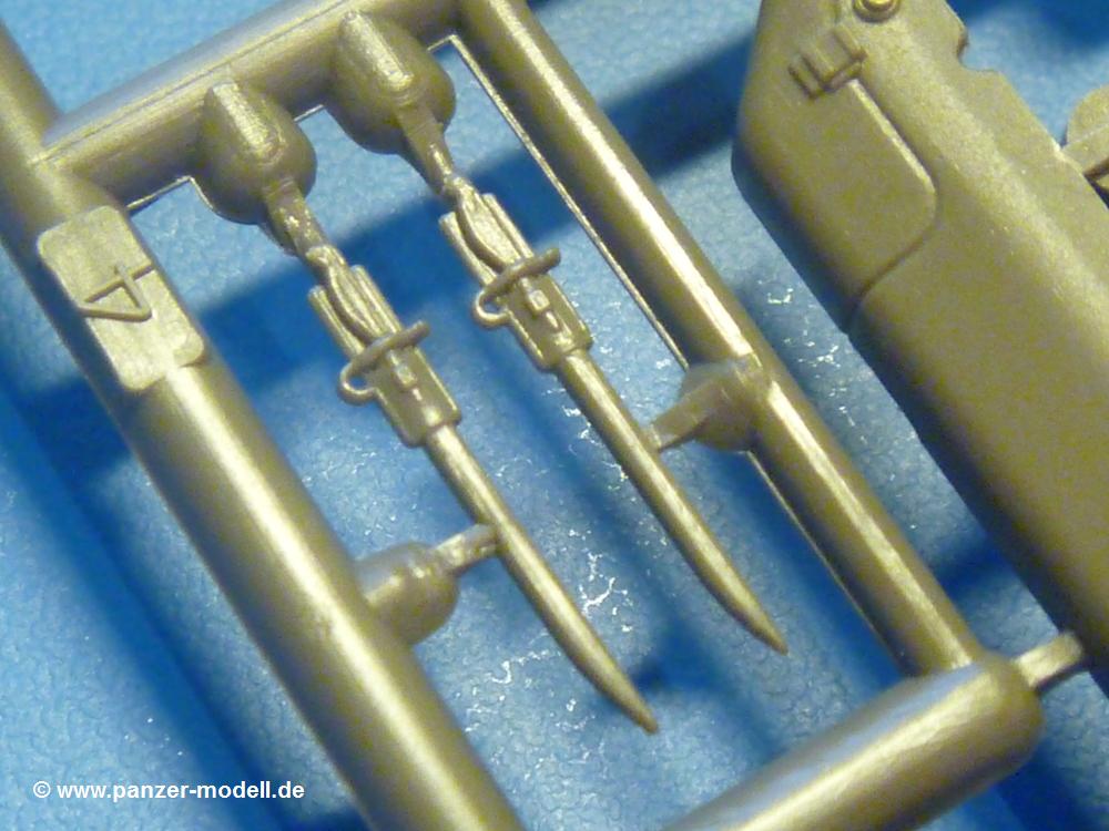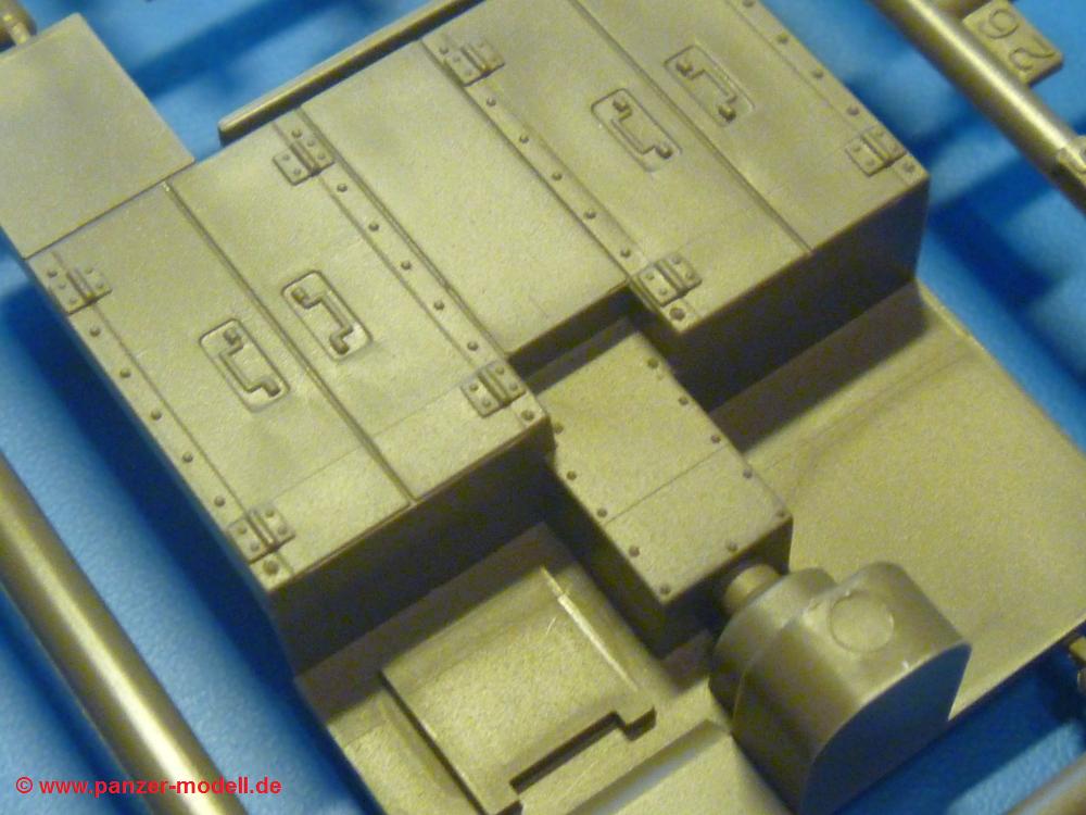Die zusammengebauten Auspuffe kommen auf ihre Plätze auf den hinteren Kettenabdeckungen. Die kleine Wartungsklappe hinter dem Kühler erhält einen Knebelgriff. Links und rechts der Klappe klebt man 2 feine Haltegriffe auf die Panzerung. Der Wagenheber erhält noch seinen Standfuß, dann platziert man ihn auf der rechten Kettenabdeckung. Etwas noch vorn versetzt klebt man die Brechstange. Die rechte Kampfraumseite bekommt noch eine genietete Panzerplatte. Dann wird die Kanonenlafette in die Traverse im Kampfraum eingesetzt (nicht geklebt) und bleibt dadurch seitenrichtbar. Auch die beiden vorderen Wartungsklappen bekommen noch je einen Knebelgriff.