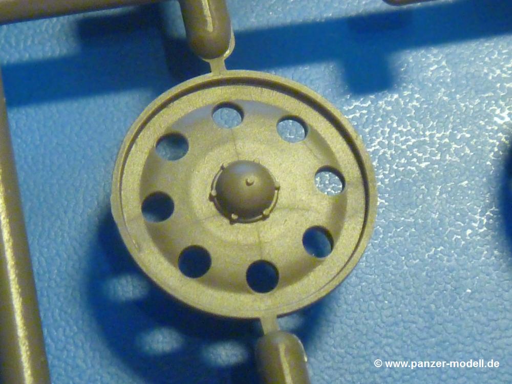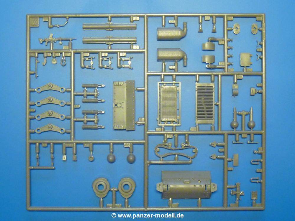 Trotz des Alters der Formen findet man keinen Formversatz und der Grat hält sich außer bei den Laufrollen in Grenzen, ist aber leicht zu entfernen. Einzig beim Kühlergrill findet man Überschussmaterial, das sich wie eine Schlange zwischen den Rippen windet, aber auch dies sollte man mit einem scharfen Bastelmesser leicht beseitigen können. Auswerferspuren auf größeren Teilen sind vorhanden, oft aber so platziert, dass man sie später nicht mehr sieht. Nur bei den Innenseiten der Kasematte fällt etwas Spachtel- und Schleifarbeit an, da diese gut einsehbar sein werden.