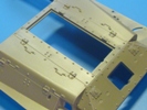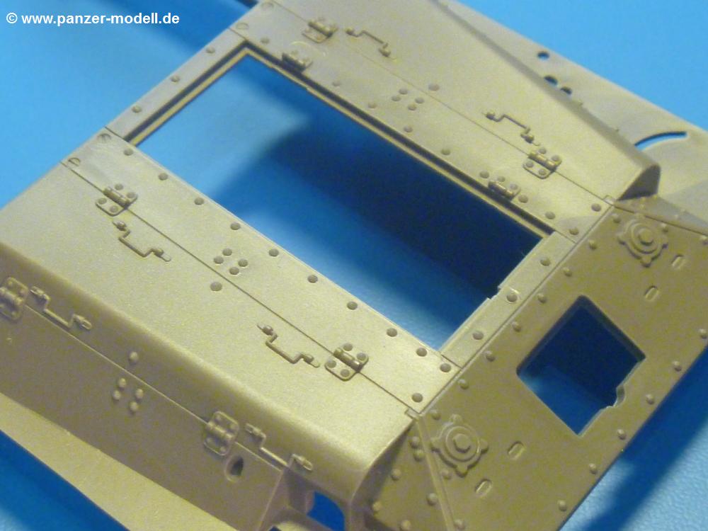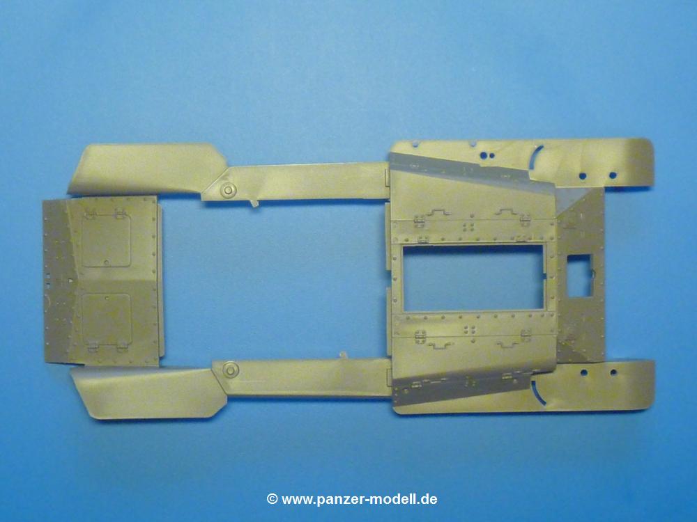 Im nächsten Schritt wir die Fahrerfront mit dem Fahrererker aufgeklebt. Die Fahrersichtklappe kann geöffnet oder geschlossen angebaut werden. Statt eines Bug-MGs in Kugelblende gibt es nur eine aufgenietete Platte. Das MG ist im Bausatz enthalten, wird aber nicht benötigt. Die Stütztraverse für die Kanonenlafette wird in die Kampfraumpanzerung eingeklebt, dann setzt man die Panzerung auf die Wanne. Ein Aufbewahrungskasten (für die Optik?) wird aufgeklebt. Die Heckklappe über dem Kühler wird nur eingesteckt, aber nicht geklebt. So kann man diese wieder öffnen, um den Kühler zu zeigen. Kleines Manko an der Heckklappe - winzige Fischhäute zwischen den Rippen stören das Bild und sollten entfernt werden. Hinter die Heckklappe kommt noch ein rechteckiger Wartungsdeckel und auf die Kettenabdeckungen die Schutzbleche der Auspuffaustritte aus der Wanne.