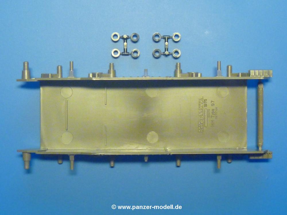 Als nächstes wird die Unterwanne vorbereitet. Der Wannenboden ist glatt ohne Details. An den Wannenseiten sind 4 Schwingarme, die Achsen des Antriebsrades und der Stützrollen und der Kettenspanner angegossen. Die Vernietung der Wannenteile gefällt mir. Die angegossenen Details kommen gestochen scharf zur Geltung. Die ebenfalls vernietete vordere Frontplatte wird eingeklebt. Mittig erhält sie ein "Auge" mit einem Schäkel. Auf die Achsen der Antriebsräder werden die Seitenvorgelege aufgeklebt. An den sichtbaren Innenseiten finden wir schön dargestellte Verschraubungen. Die Federaugen der mittleren Federn werden an die Wanne angeklebt, darüber kommt die Federabdeckung. Die mittleren Federn sind nicht als solche vorhanden, da die Abdeckung diese sowieso voll umgibt. Dann montiert man noch Spiralfedern aus dem ersten Bauabschnitt. Die Kettenspanner werden mit einem Winkel geschlossen, an dem sich eine deutlich erkennbare Befestigungsschraube befindet.