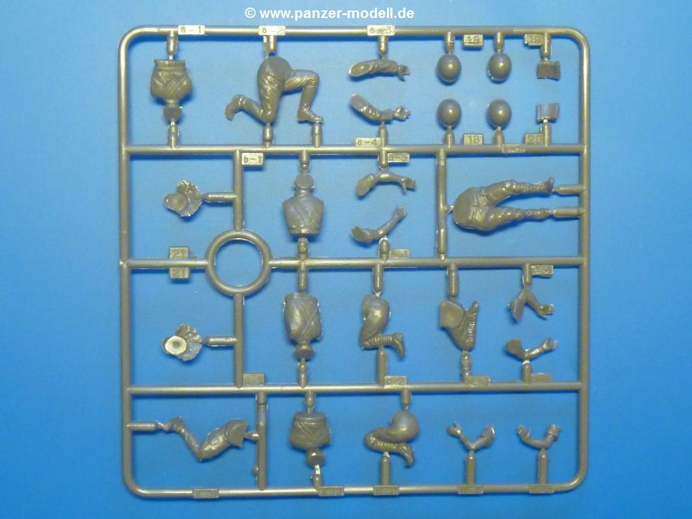 - 1x: 1 Offizier und 3 Soldaten aufgeteilt in Oberkörper mit Kopf, Arme, Beine, Munitionstaschen, Helme, Mützen mit Tropenschutztuch