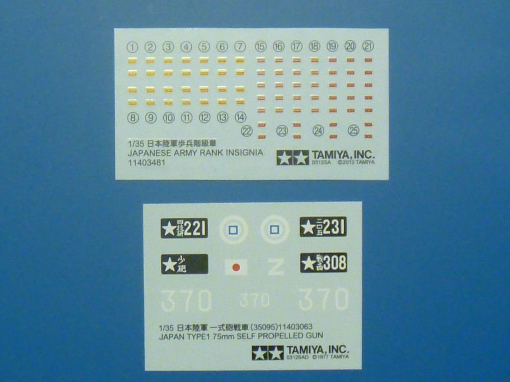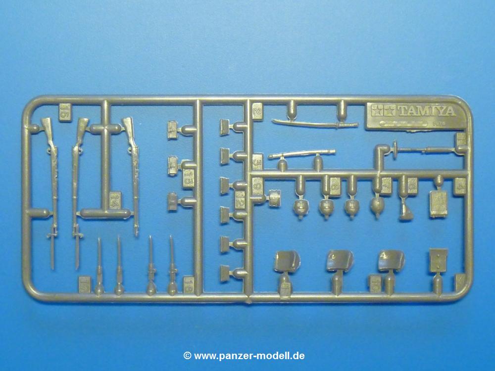 Bisher konnte ich, außer dem von Tamiya, keinen Spritzgussbausatz des Ho-Ni 1 finden. Diese Tatsache macht sich die Firma zu Nutze, um sein Ursprungsmodell ab und zu in neuer Packung teils unter Zugabe von Figuren wiederaufzulegen. So auch in diesem Fall. Offensichtlich sind die Formen unverändert, denn die Jahresaufdrucke auf den Spritzlingen gehen zurück bis 1975 für die Teile, die baugleich mit dem Tamiya Chi-Ha sind, und bis 1977 für die Ho-Ni Teile. Auch die Bauanleitung für das Fahrzeug ist seit fast 37 (!) Jahren unverändert. Die zusätzlichen Figuren kennt man auch als eigenständigen Satz als Japanese Army Infantry und datiert auf 1976 zurück. Nun, der Bausatz ist zwar alt, so dass man kein Feuerwerk an Details, Inneneinrichtung und Ätzteilen erwarten kann, aber… es ist ein Tamiya Modell und damit ein Garant für gute Arbeit. Schauen wir mal, wie sich das ausdrückt.