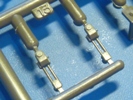 Nun kann man sich dem Zusammenbau des 75mm Kanonenrohrs widmen. Das Rohr besteht aus 2 Hälften mit einem Teil des Verschlussblocks. Die Mündung wird separat aufgeklebt. Der Verschlussblock zeigt sehr schön den Einsatz des Zündbolzens und wird in geöffneter Stellung (Ladestellung) eingeklebt, bevor man Verschlussblockoberteil und -endstück anklebt. Der Öffnerhebel ist bereits in geöffneter Stellung am Oberteil angegossen. Zum Schluss klebt man die Gleitschiene unter das Rohr.