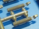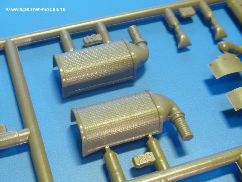 Der Ho-Ni hat wie der Chi-Ha jeweils links und rechts auf den hinteren Kettenabdeckungen einen Auspuff. Jeder besteht aus 3 Teilen, dem Austrittsrohr mit angegossenem Schutzgitter, dem Endstück und dem Endrohr. Auch wenn das Schutzgitter kein Ätzteil ist, die Gitterstruktur ist gut getroffen.