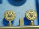 Im ersten Schritt werden Antriebs-, Leit-, Laufräder und Federn zusammengesetzt. Dabei ist vorgesehen, dass die Räder drehbar bleiben. Bei den Laufrollen sind die Verschraubungen und Verstärkungsrippen sehr schön dargestellt, auch wenn die sehr feinen Sicherungsdrähte der Schrauben fehlen. Der Grat auf der Lauffläche eines jeden Rades stört ein wenig, sollte aber kein Problem darstellen. Es gibt 2 verschiedenen Sorten Laufrollen. Zum einen pro Seite 2 Laufrollenpaare, die als erstes und letztes Laufrad auf einen eigenen Schwingarm kommen werden. Zum anderen 4 Laufrollenpaare, die zu je 2 Laufrollenwagen pro Seite mittels eines Verbindungswinkels zusammengefasst werden. Hier kommen dann auch die separaten Laufrollennaben zum Einsatz. Die Antriebsräder bestehen nur aus dem inneren und äußeren Zahnkranz. Auf den ersten Blick erscheinen einem die Nieten an den Antriebszahnkränzen etwas flach, aber das Original zeigt, dass Tamiya richtig liegt. Eine Gummibuchse im Inneren wird die Drehbarkeit sichern. Auch die mit 8 runden Löchern durchbrochenen Leiträder werden sich drehen können, nur wird dies hier durch einen Plastikbolzen erreicht, der in das innere Leitrad eingesetzt wird. Jede Spiralfeder besteht aus 2 Teilen, dem Federkörper mit einem Flansch und der zweite Flansch separat. Die Darstellung der Feder ist durchaus akzeptabel.