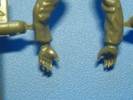 Interessant ist der stürmende Soldat mit dem 50mm Type 89 Kniemörser. Den Mörser habe ich früher für ein Pioniergerät gehalten, da mir so etwas als Waffe noch nicht untergekommen war. Auch dieser Soldat besteht wie der Offizier aus den beiden Armen, dem Oberkörper mit Kopf und der Hüfte mit den Beinen. Wie die beiden anderen Soldaten trägt er Kampfschuhe mit kniehohen Wickelgamaschen. Seine Ausrüstung besteht aus dem 50mm Type 89 Kniemörser, den er in der rechten Hand hält. Dazu trägt er auf dem Rücken sein Gewehr. Auch wenn der Gewehrriemen quer über die Brust des Soldaten läuft, so muss man doch den Riemen von der Figur zum Gewehr noch selbst herstellen, sonst schwebt es auf wundersame Weise auf seinem Rücken. Weitere Ausrüstungsgegenstände sind 2 große Munitionstaschen vorn am Koppel für die Mörsermunition. Seitlich links am Koppel kommt das Bajonett und eine Feldflasche. Der Flasche folgt eine Munitionstasche für die Gewehrmunition. Hinten am Koppel wird der "Brotbeutel" befestigt.