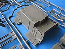 Das Anhängermodul ist ebenfalls mit einteiligem Unterbau versehen unter den ein Fahrwerksteil mit Achse geklebt wird. Die Seitenwände werden einzeln angeklebt um den Laderaum abzuschließen.
