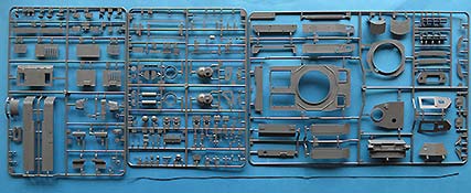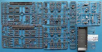 Im Karton finden wir 7 dunkelgraue und einen hellgrauen Spritzling, die Unterwanne, Textilseilmaterial, Draht, Polycaps und ein Decalbogen.