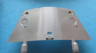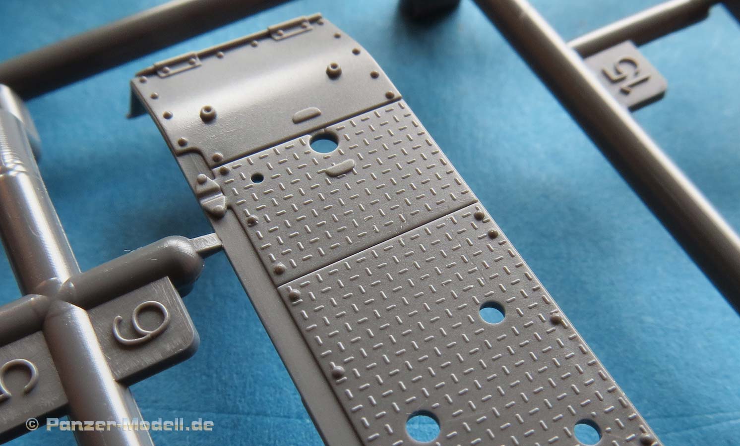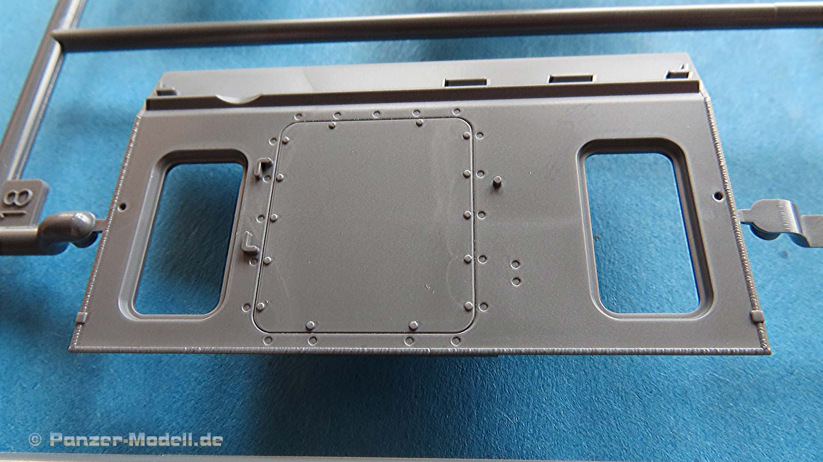 Die Oberwanne setzt sich auch einer einteiligen Deckplatte mit all den Öffnungen für die Motorluken, sowie Fahrer- und Funkerluke und den Aufbauseitenwänden zusammen. Die Details hier sind wirklich schön und fein dargestellt. Die Luken liegen wie gesagt einzeln bei und können offen oder geschlossen gebaut werden - aber wie so häufig macht "offen" nur Sinn, wenn man selber noch eine Inneneinrichtung einbaut, denn im Bausatz selber ist keine vorhanden.