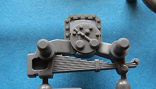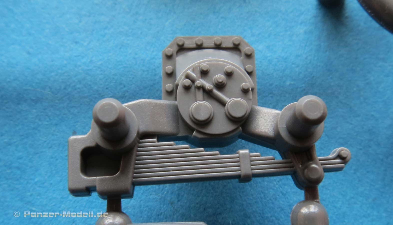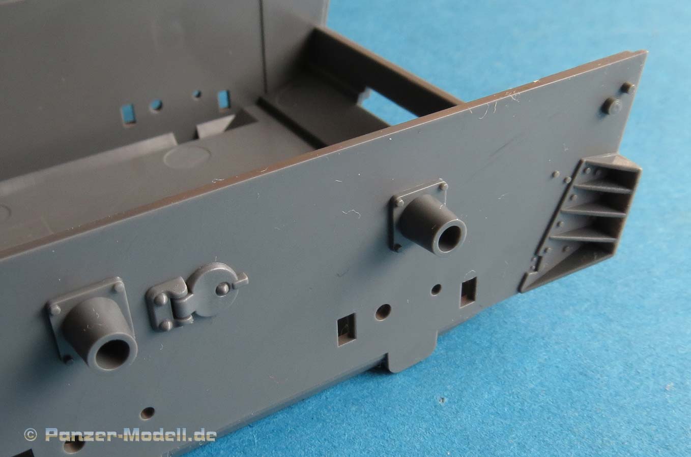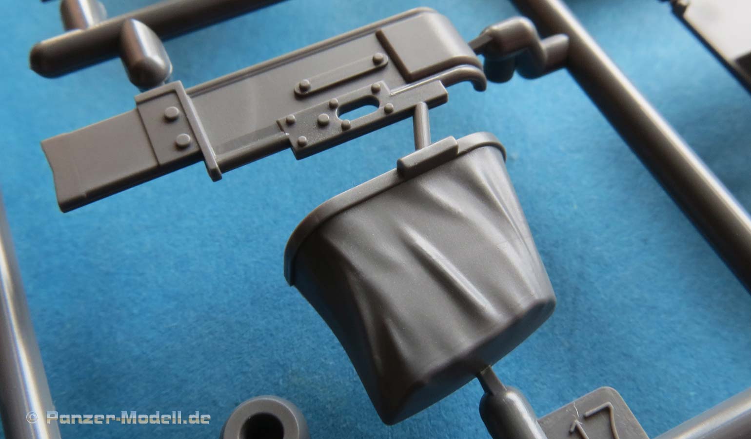 Das Bordwerkzeug, das auf den Kettenblechen angebracht wird, sieht soweit ganz gut aus und hat die Halterungen bereits mit angegossen. Das Abschleppseil ist mit den Kauschen aus Plastik mit faserfreiem Textilseil darstellbar - ist zwar nicht so schön wie ein verdrilltes Kupferseil, aber es reicht.
