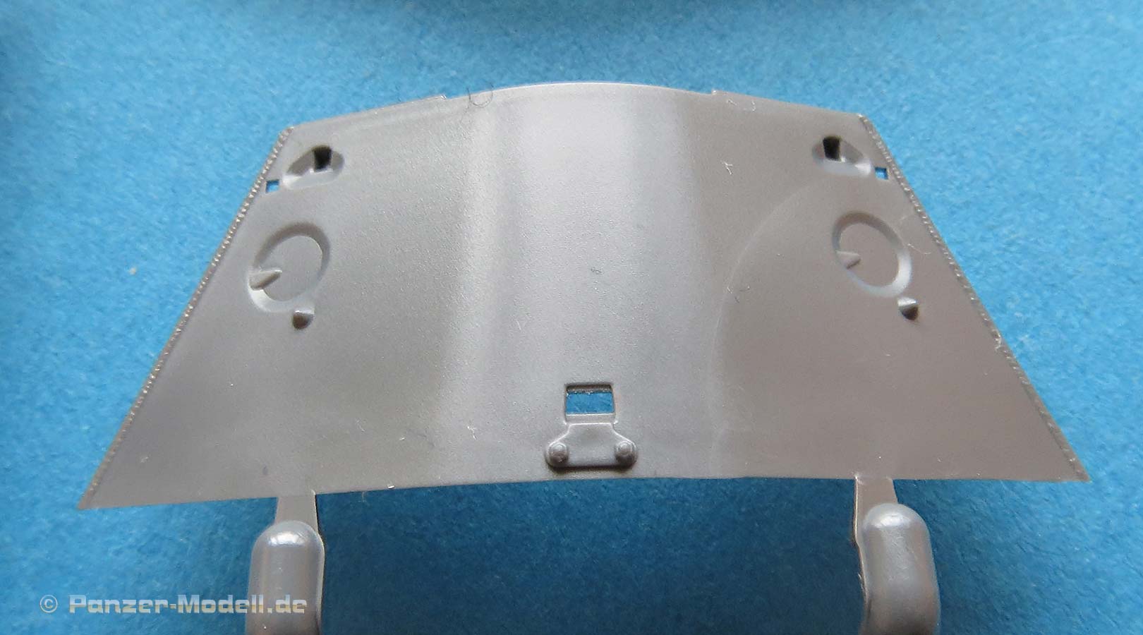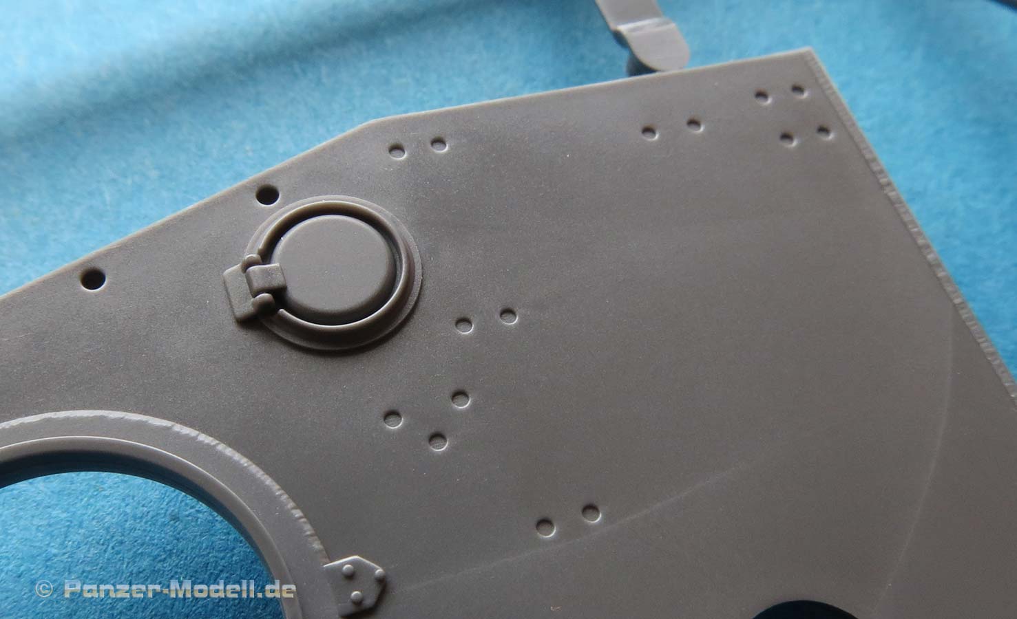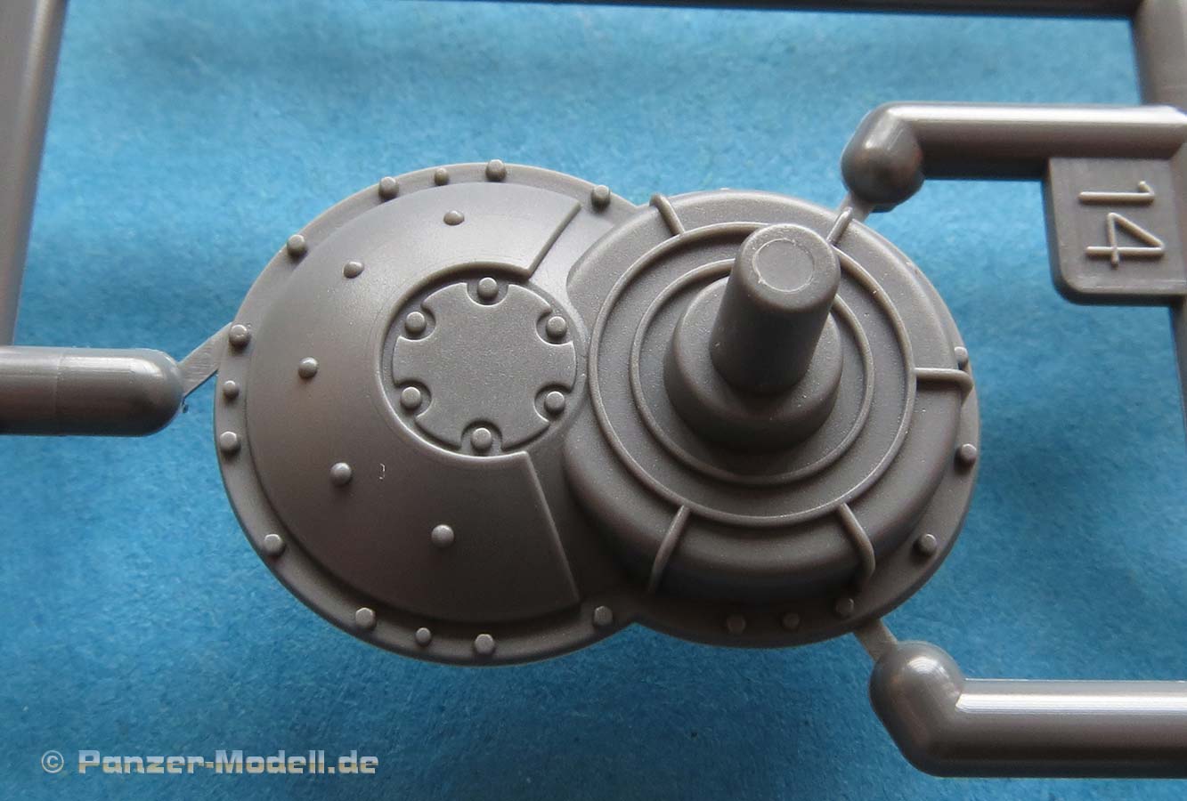 Die Turmdeckplatte sieht ganz schön aus und weist an den Kanten feine Schweißnähte auf. die markanten Senkkopfschrauben sind leider etwas unterdetailliert, denn tatsächlich sieht es nur nach einfachen, runden Vertiefungen aus.