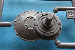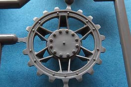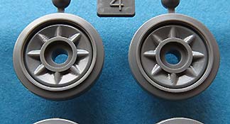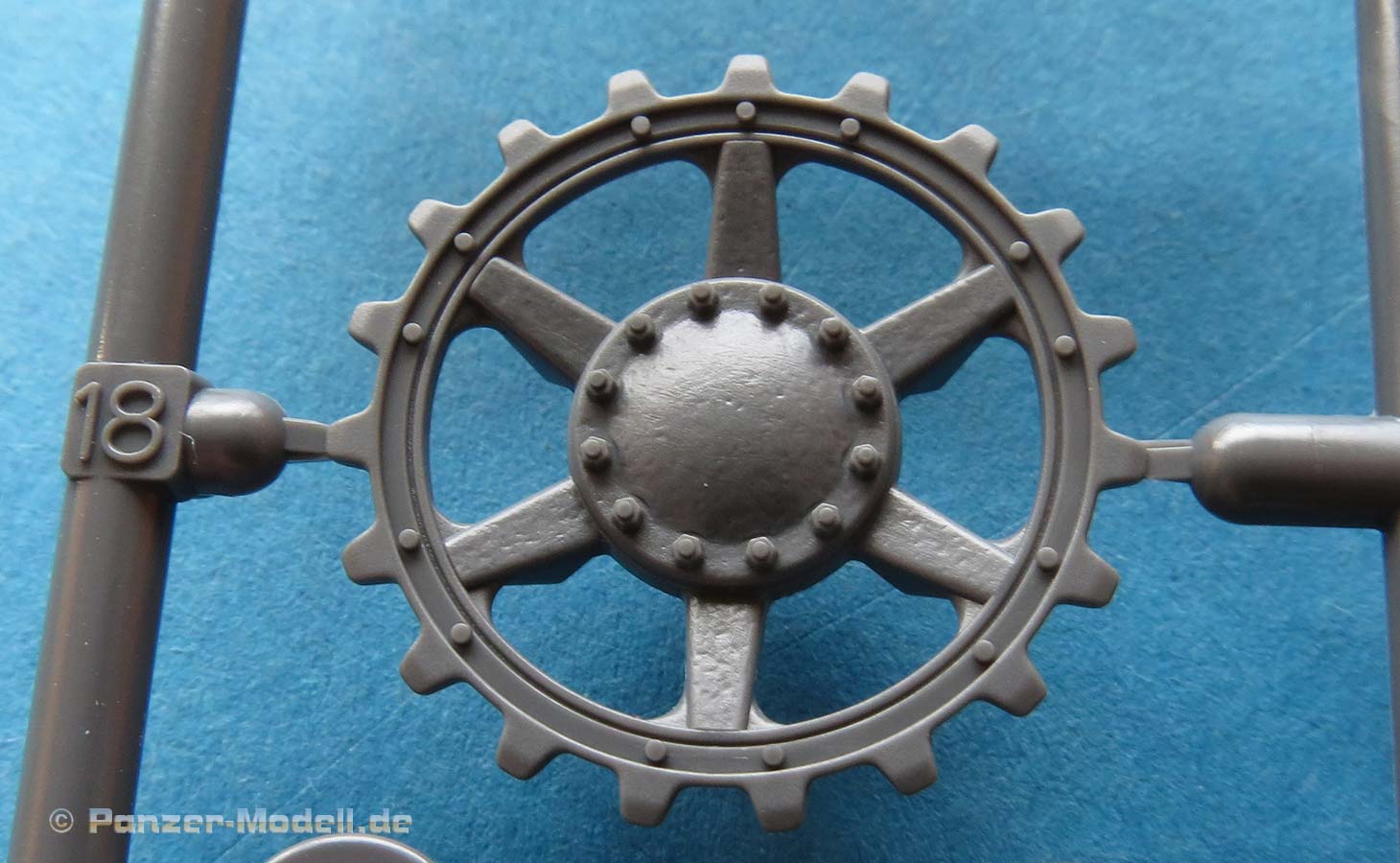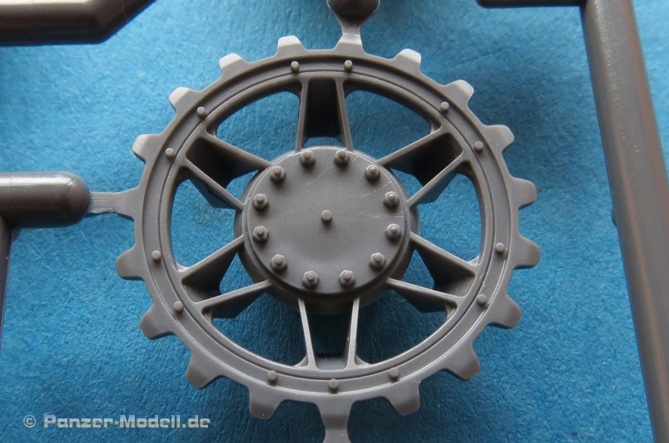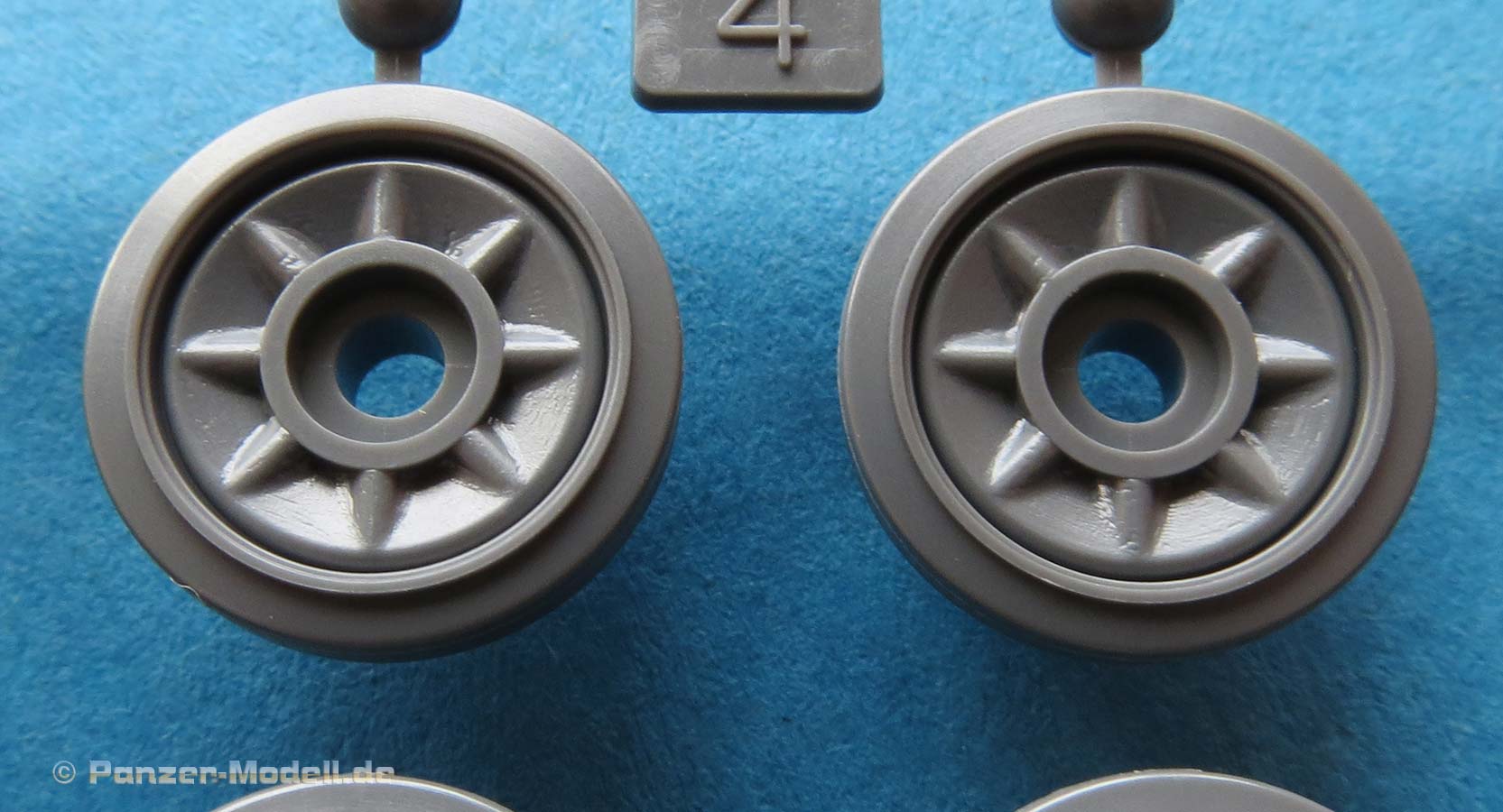 Die Laufrollen setzten sich aus zwei Einzelrollen und der Nabenabdeckung zusammen und sind sauber und mit guten Details gespritzt. Und sehr angenehm ist auch dass diese an nur einem Anguss setzten, d.h. die Arbeit des Abtrennens und Versäuberns hält ich in Grenzen. Leider sind die Radgummierungen völlig glatt ohne jeglichen Herstelleraufdruck - ist zwar auch hier noch nie Tamiyas Anspruch dieser extrem feinen Superdetaillierung gewesen, aber es würde insgesamt einfach einen besseren Eindruck machen, wenn hier sich ein paar feine Details finden würden.