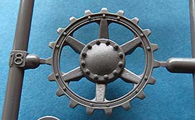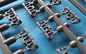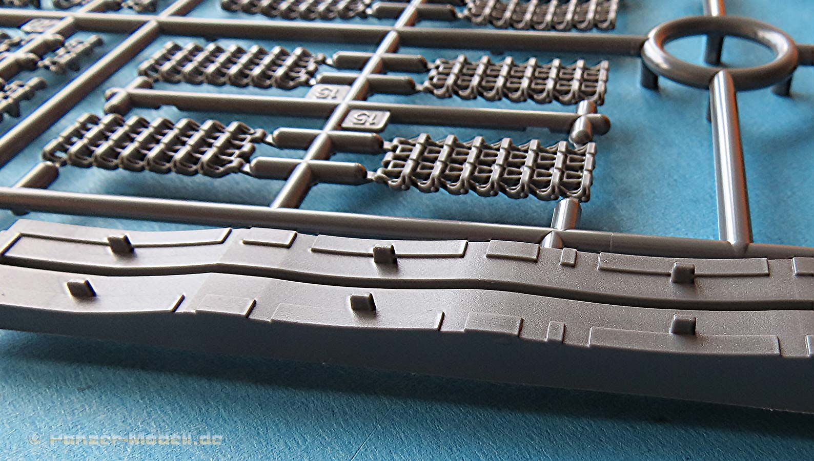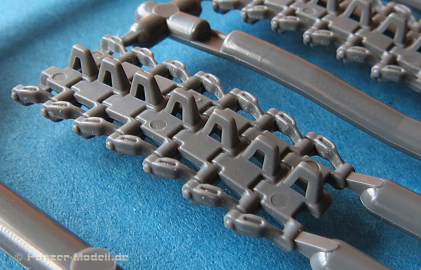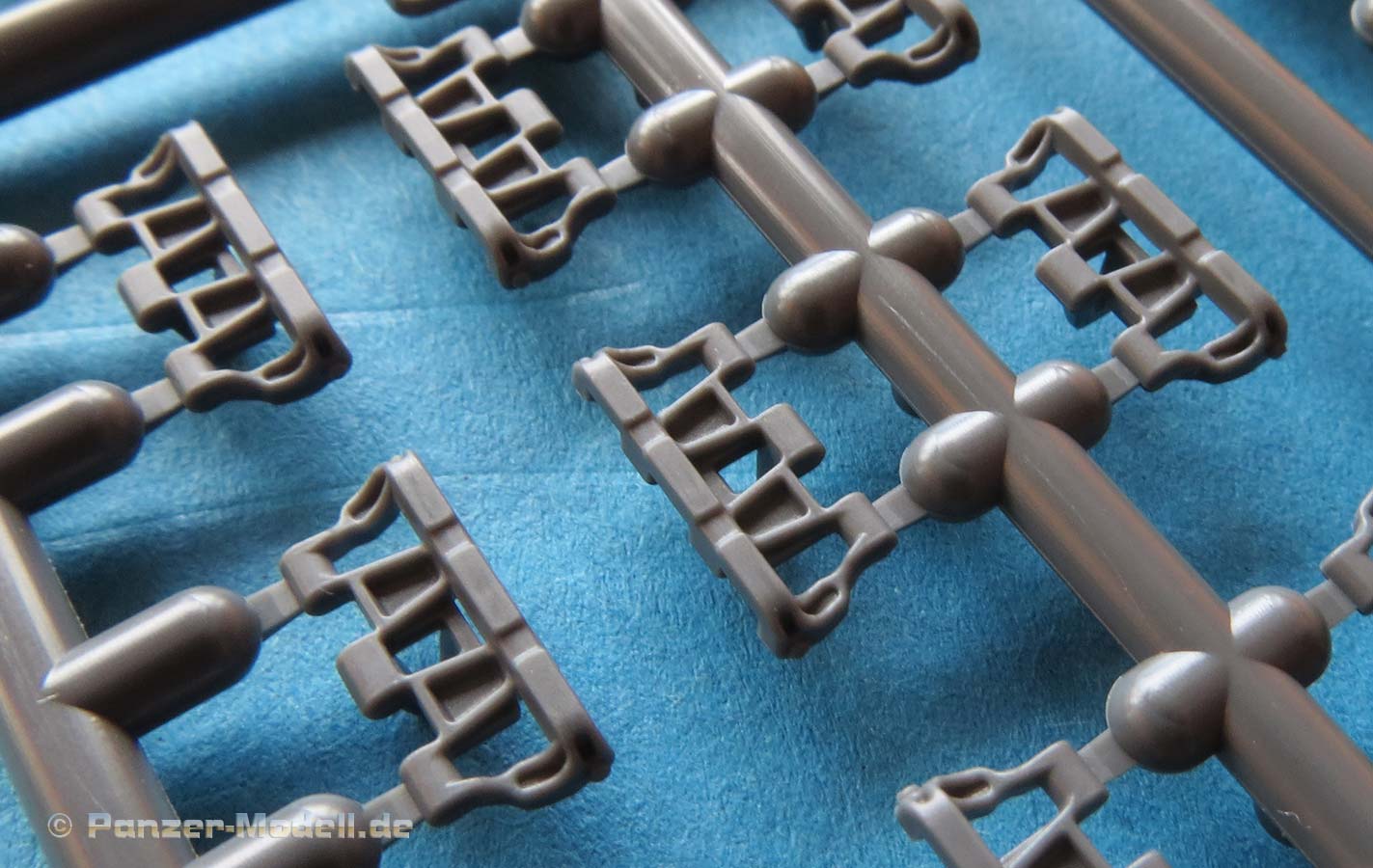 Die Kette besteht in großen Teilen aus langen Segmenten und einigen Einzelgliedern für die Umläufe um Leit- und Treibrad. Die hier enthaltenen Einzelglieder sind sauber gespritzt und mit zwei Angüssen versehen. Die Optik ist auf jeden Fall ganz hervorragend, allein mit dem offenen Führungszahn.