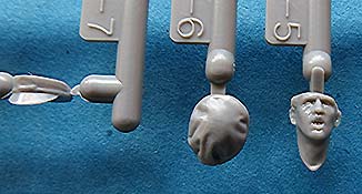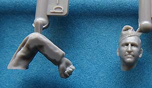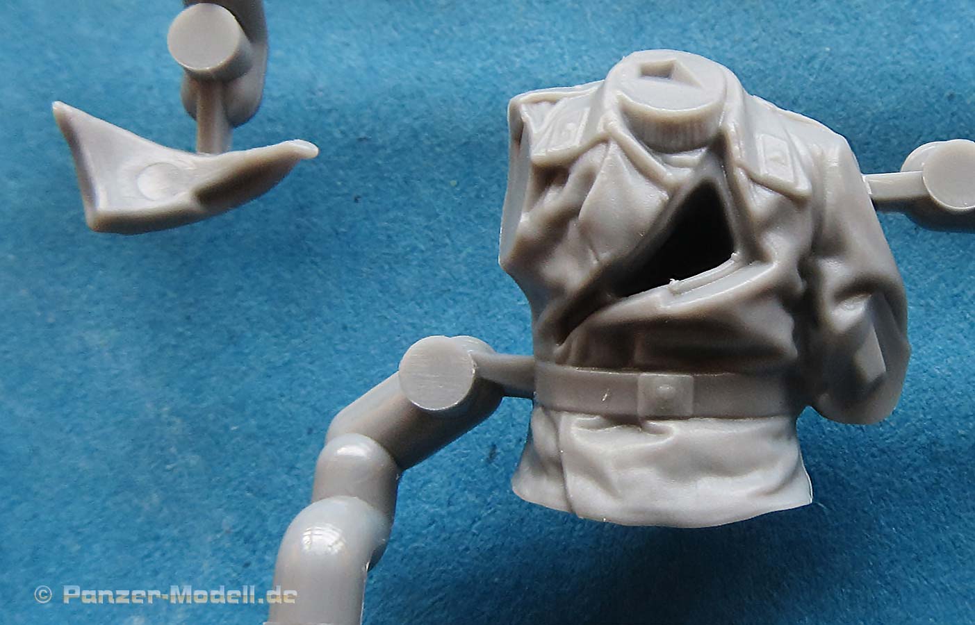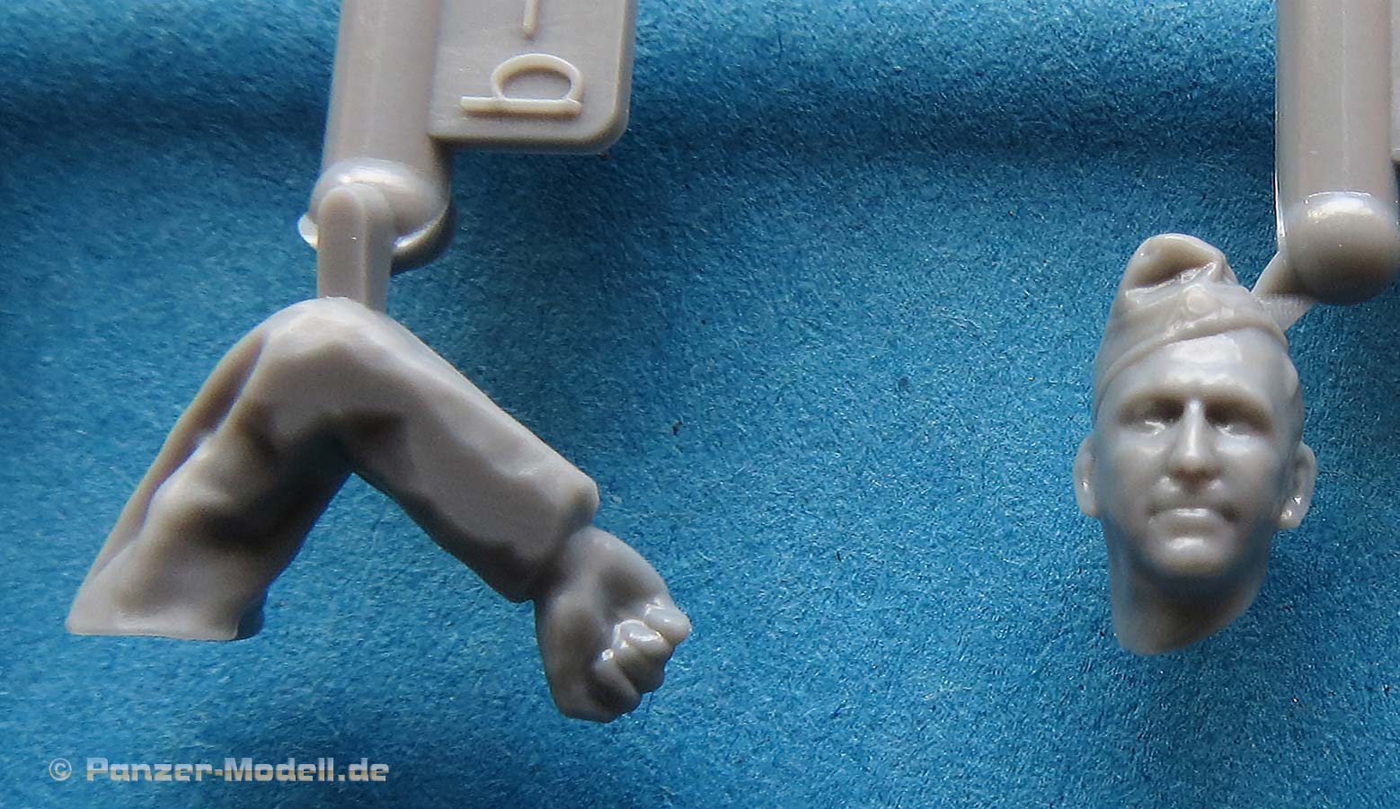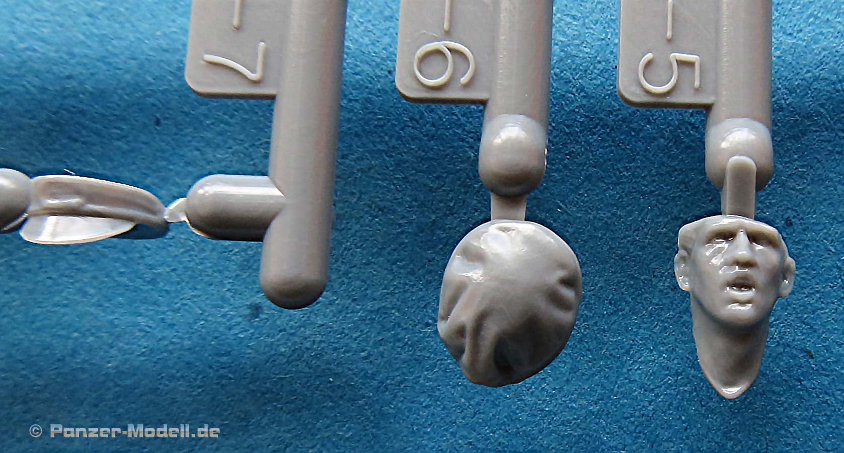 Auch die Luken im Turms lassen sich alle offen oder geschlossen bauen - aber auch hier, trotz der dargestellten Innendetaillierung der Kanone, ist der Turm im Grunde innen leer. Von daher offene Luken besser nur wenn man eine Figur in die offene Luken setzt oder stellt - und wo wir bei dem Thema sind, wäre Tamiya nicht Tamiya, wenn diesem Bausatz nicht zumindest 3 passende Figuren beigefügt hätte. Diese sind Spritzgussfiguren aus wenigen Teilen mit sehr schönen Posen und guten Details. Für die eine Figur liegen sogar zwei verschiedene Köpfe bei. Die Gesichter der Figuren sind ausdrucksstark und sauber modelliert und gespritzt. Von den Posen her ist eine Figur für die Kommandantenkuppel und die beiden anderen für die jeweiligen Seitenluken im Turm.