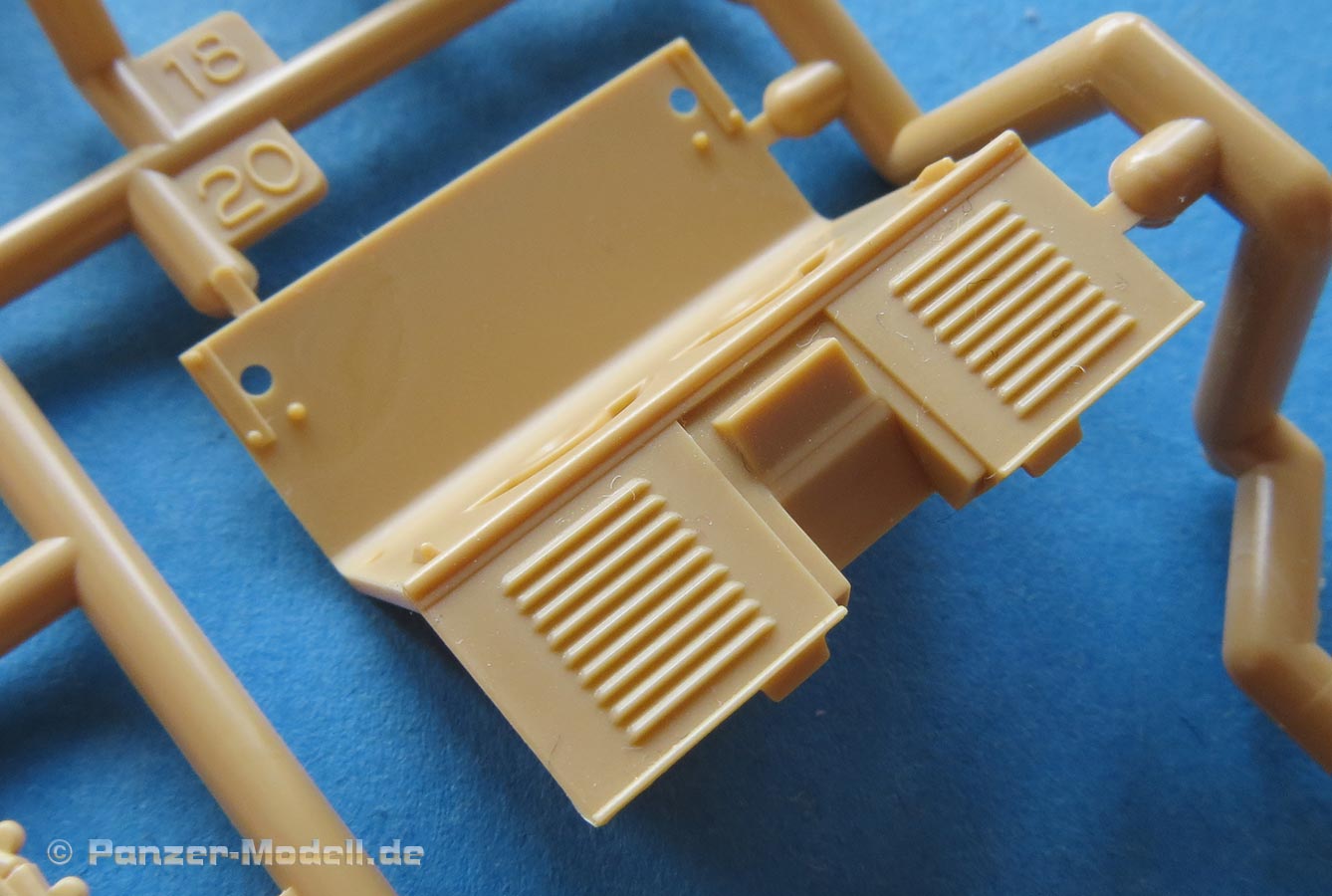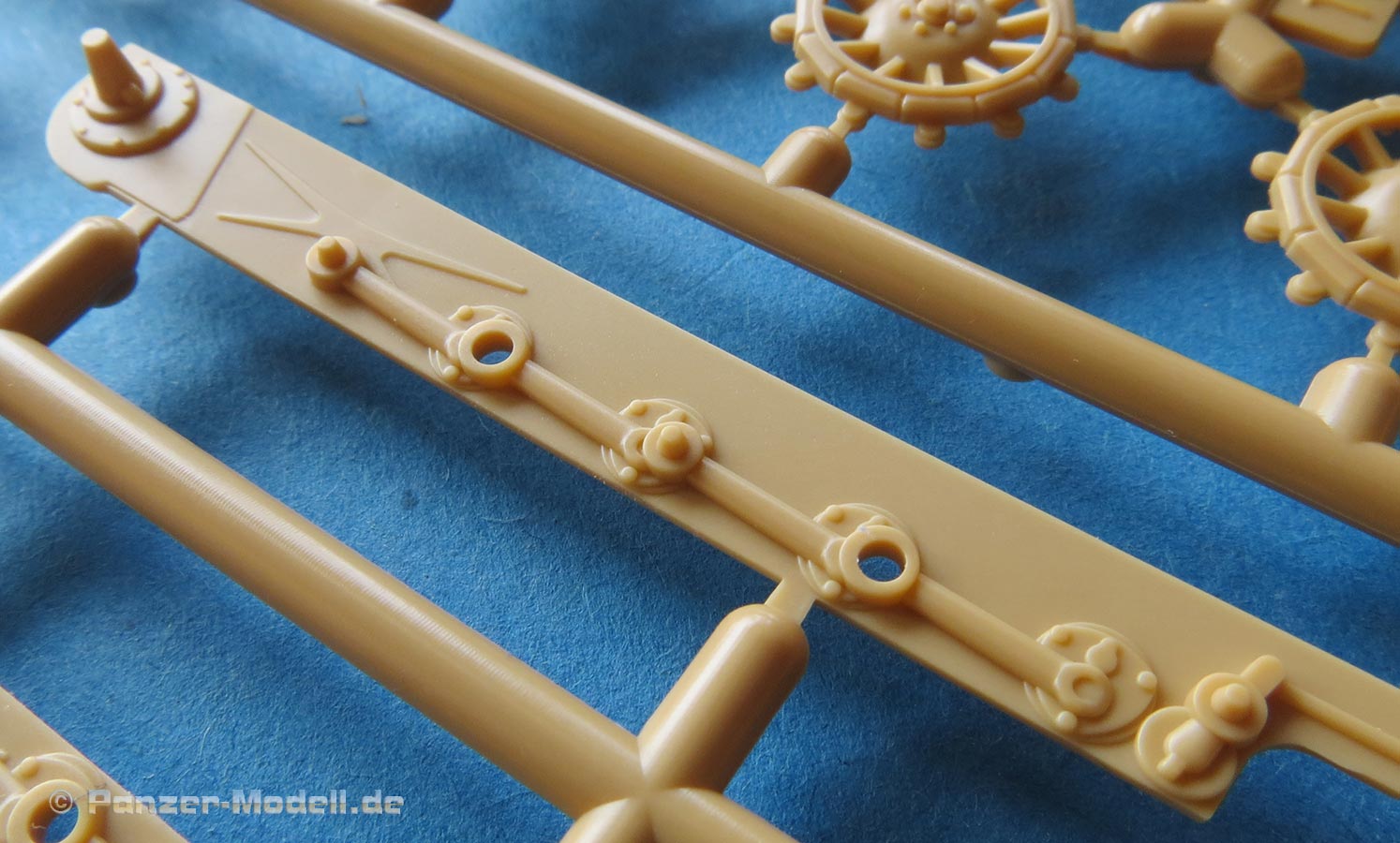 Das Laufwerk mit den überlappenden Laufrollen ist zwar mehrteilig, aber hier wurde ertwas getrickst und die Laufrollen nicht einzeln, sondern mehrere Räder zusammengefasst zum leichteren Anbau. Die Details der Laufrollen sind fein und sauber, auch das Vorderrad ist wirklich fein und sauber detailliert gespritzt.
